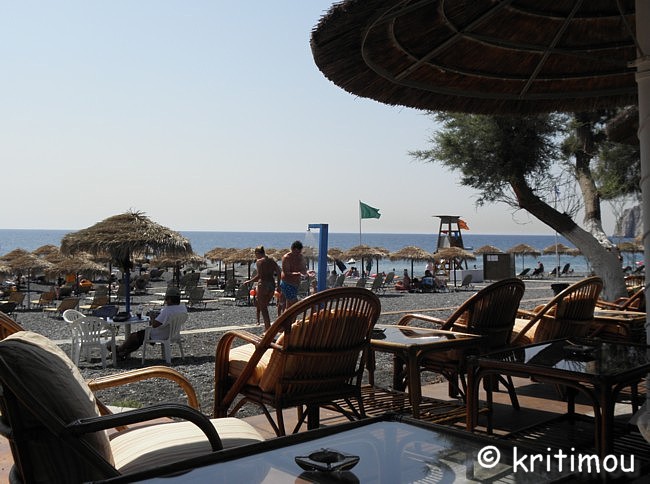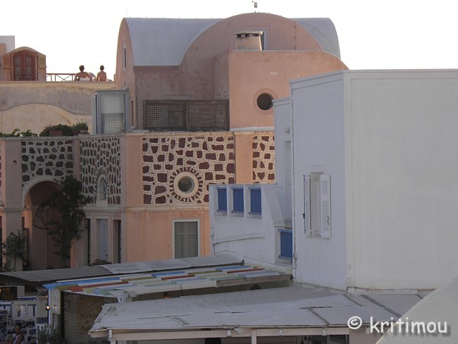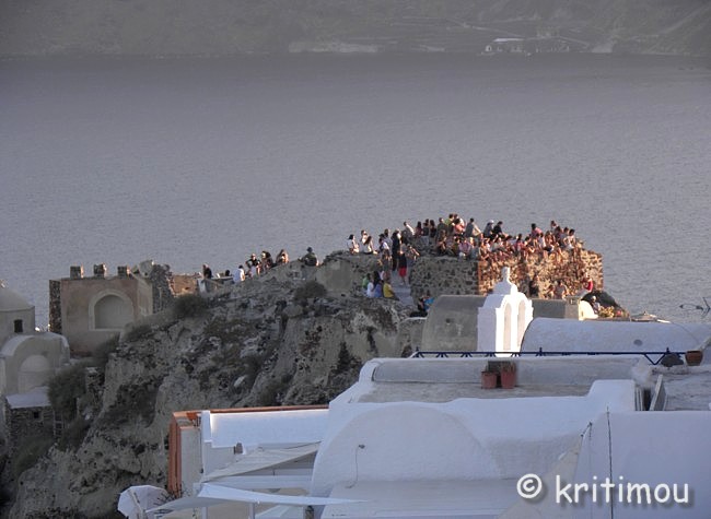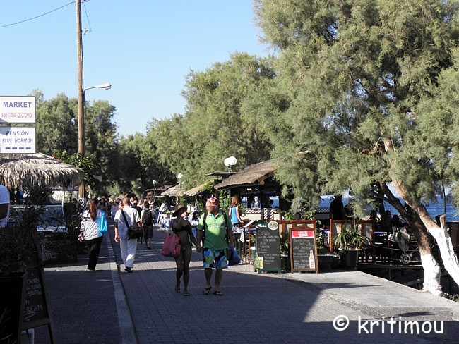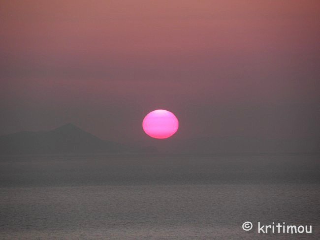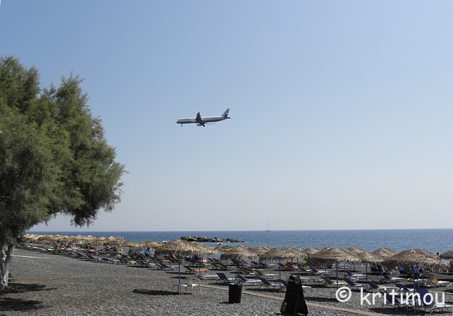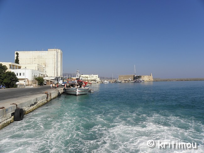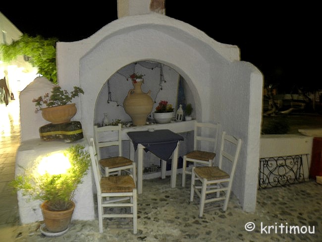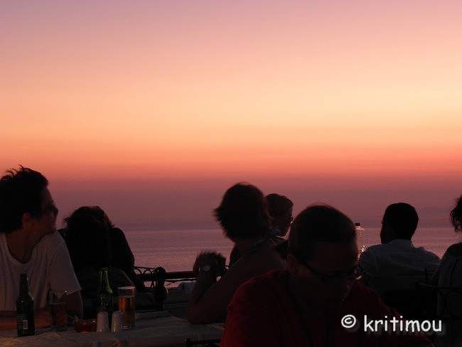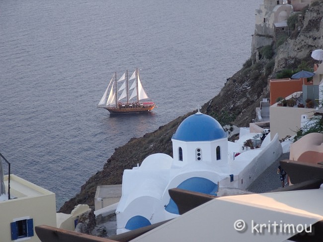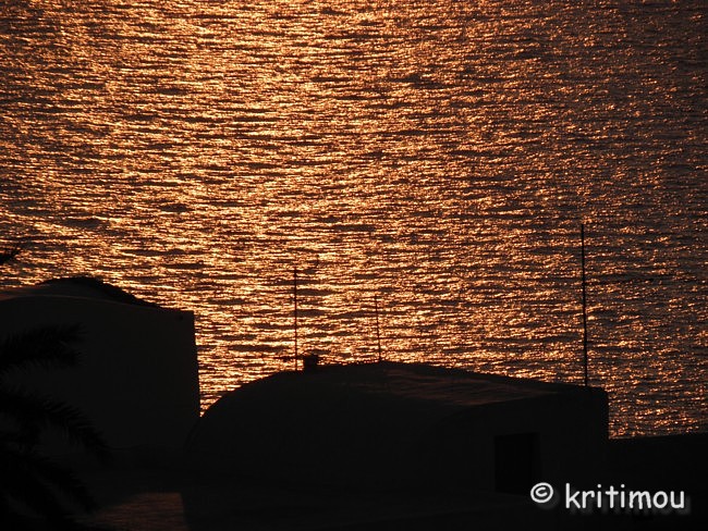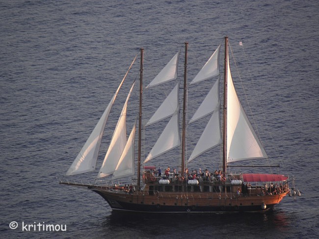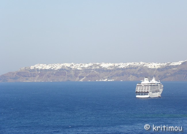 Schon recht früh machen wir uns auf den Weg zum Hafen von Iráklio. Das Zimmer in Kalamáki war wunschgemäß vorausbezahlt worden, sodass wir abfahren können, ohne jemanden wecken zu müssen. Kaffee gibt es so früh noch nirgendwo im Ort, denn gerade erst ist die Sonne aufgegangen. Leise beladen wir den Mietwagen und schon sind wir unterwegs. Als wir in Kamilári, gegenüber dem Friedhof, nach rechts abbiegen, wird das Licht der noch tief stehenden Sonne zigfach durch die Eukalyptusbäume am Straßenrand gebrochen, sodass ein flirrendes Muster von Hell und Dunkel auf der Straße entstanden ist. Ganz allein sind wir hier unterwegs, durchfahren das blendende Lichtspiel. Dabei kommt etwas Wehmut auf ob unseres nur sehr kurzen Aufenthaltes auf Kreta, denn in diesem Augenblick erinnere ich mich an einige ähnlich schöne, frühmorgendliche Naturerlebnisse in der Region. Vielleicht sollten wir doch einmal wieder einen längeren Aufenthalt einplanen. Gemütlich tuckern wir über die Hauptstraße, rollen durch das noch schlafende Pétro Kefáli und das gerade erwachende Míres. Bald schon haben wir den nördlichen Ausläufer der Messará durchquert und fahren zur Inselüberquerung die Kurvenstrecke bergan, schauen immer wieder hinunter und genießen den Blick in die diesige Landschaft der Messará, die vom Sonnenlicht zart beschienen wird. So sanft die Ebene von hier oben erscheinen mag, so gnadenlos heiß wird es am heutigen Tag dort wieder werden. Um die vierzig Grad sind gemeldet. Auf den Kykladen wird es sicherlich etwas erträglicher sein. Wir sind noch so früh an, dass wir in Agiá Varvára einen Zwischenstopp zum Frühstücken einlegen können, früher eine fast schon kultische Handlung. In Agia Varvára zu stoppen gehörte absolut zu jedem Südküstenbesuch oder –aufenthalt oder zu einer –rückkehr dazu. Man nahm dann den darauffolgenden Bus, um die Fahrt fortzusetzen. Messará-Besucher vergangener Jahrzehnte werden sich noch gut daran erinnern können. Agia Varvára bietet heute eine gute Infrastruktur. Sogar ein Zentrum mit Ärzten und Sozialarbeitern gibt es hier, die sich um die Belange der Menschen in den Bergdörfern der Region kümmern. Nicht zu vergessen auch die Windkraftanlage in der Nähe, die bis in die Messará hinein Haushalte mit Strom versorgt. So früh an diesem Morgen finden wir auch hier erst ein einziges geöffnetes Café. Wir setzen uns auf die der Straßenseite zugewandte Terrasse. Wie eh und je brettern LKWs und Baufahrzeuge mit ohrenbetäubendem Lärm auf der Transitpiste durch den Ort. Nach wenigen Minuten erhalten wir Kaffee und Toast. Ein älterer Herr sitzt stoisch auf seinem Stuhl und schaut uns beim Essen zu. Wetten, das er darüber nachdenkt, ob Alex ein Grieche ist oder ein Araber oder doch ein Israeli ... aber mit sehr guten Griechisch-Kenntnissen? Der einfache und saubere Toilettenraum hier birgt noch eine kleine Überraschung, mit einer Toilettenpapierhalterung, die originellerweise knapp unter der Decke, oberhalb der Fliesen, in etwa 1,80 m Höhe, mit dicken, langen Stahlnägeln angebracht ist, die zentimeterlang aus der Betonwand herausragen. Überfahrt Ich muss gestehen, dass ich gehörigen Respekt vor der Reise mit dieser Fähre hatte, weil mir auf einem kleineren Schiff (einem Flying Dolphin), auf dem man sich ebenfalls während der Fahrt nicht draußen aufhalten durfte, vor einigen Jahren schon einmal sehr, sehr schlecht geworden war. Doch die Φλαινγκατ 4 (Flying Cat) der Hellenic Seaways ist wesentlich größer und geräumiger, bilde ich mir ein. Leider gab es nach unseren Recherchen kaum ein Angebot für eine „normale" Fähre, sodass wir schon fast gezwungen sind - will man nicht zu Nachtzeiten herumreisen - eines dieser preislich anspruchsvollen Schnellboote zu nehmen. Am Vorabend hat man in den Nachrichten Wind gemeldet. Um der Seekrankheit vorzubeugen, versuche ich es mit Reisekaugummi. Das sich einstellende Taubheitsgefühl auf der Zunge und im Rachen trägt nicht unbedingt zu einem guten Gefühl bei, als wir die Fähre bei schaukelnden Wellen besteigen. Zwei Stunden lang werde ich es wohl aushalten, falls es überhaupt zum Unwohlsein kommen wird. Damals waren es vier, und ich dachte, dass ich das Schiff bei der Ankunft nicht aufrecht gehend verlassen könnte. Bevor wir zusammen mit vielen anderen Passagieren im klimatisierten Inneren der „Fliegenden Katze" Platz nehmen, lassen wir den Blick ein wenig im Hafen herumschweifen, saugen die letzten frischen Sauerstoff- bzw. Nikotinpartikel ein. ![]() Danach suchen wir unsere reservierten Plätze auf. Gut, das wir die Tickets vorab erworben haben (48,00 € pro Person – Stand 18.7.2011), denn das Schiff ist vollends ausgebucht. Auf dem Großbildschirm verfolgen wir die Nachrichten des Tages. Der Taxifahrerstreik hat sich ausgeweitet. Im Flughafen von Iráklio geht zur Zeit nichts mehr, Taxler sollen ihn dichtgemacht haben, um ihren Forderungen mehr Gehör zu verschaffen. In den Krankenhäusern wird ebenfalls gestreikt, und in Kavála rüstet man sich gerade zu einem Demonstrationszug. Ein Land im Aufruhr? Währenddessen schaukelt die Fähre nach Verlassen des Hafenbeckens durch tiefe Wellentäler kräftig von rechts nach links und zurück, sodass die Gischt bis an die Fenster spritzt. Nur langsam gewöhne ich mich an den Rhythmus; die anderen Fahrgäste scheinen unbeeindruckt, strömen unentwegt zum Essens- und Getränkeschalter. Ein paar braungebrannte Jungs umgarnen die nette Fährbegleiterin, während auf dem Meer weiße Schaumkronen tanzen. Irgendwie finde ich jetzt doch Geschmack an der schnellen und modernen Art des Reisens (aber nur, wenn der Wellengang nicht höher wird). Wer es eilig hat, ist mit diesem Schiff wirklich fix unterwegs; in zwei Stunden von Kreta nach Santorini – ideal für die sommerlichen Island-Hoppers. Allerdings kann man das sonnenbeschienene Meer nicht sehen, weil die Fenster wie bei einem Regenguss unentwegt nassgespritzt werden und Jalousien 