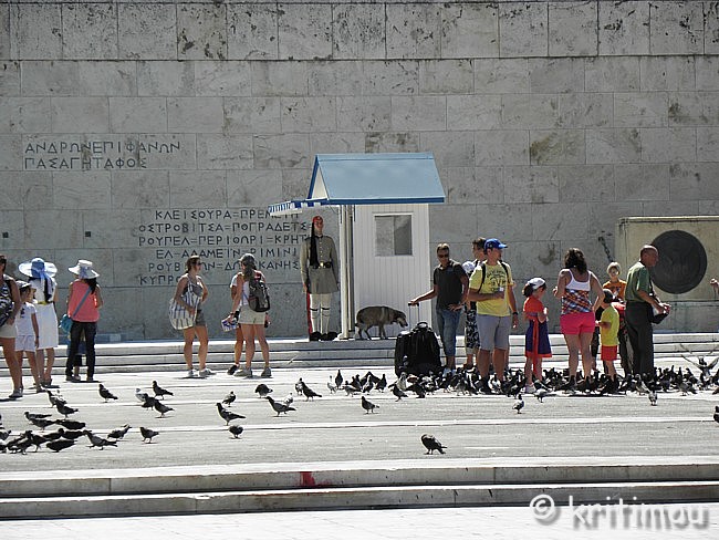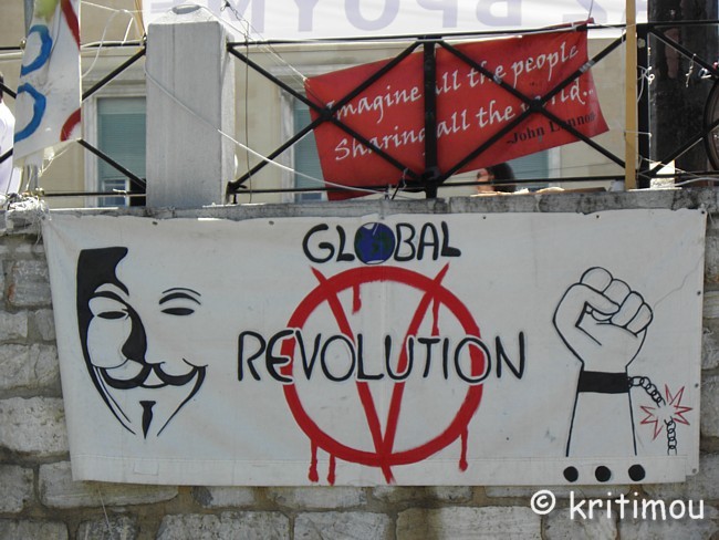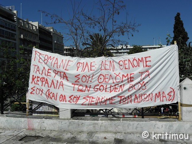 Über allem das menschliche Leben Transparente mit unterschiedlichen Forderungen wurden angebracht, fast alle auf Griechisch. Der Tenor lautet: Wir zahlen nicht die Zeche der "da oben"! Für eine direkte Demokratie! ![]() Unmittelbare Demokratie überall - Soziale Kontrolle, Volksgesetzgebung, Solidarität ![]() Das Mittelfristige kommt, die Demokratie geht (Sie haben uns sogar die Unterhosen weggenommen) ![]() Sei die Wende, die du sehen möchtest ![]() Ruhige Platía ![]() Nie wieder Faschismus ![]() Freiheit - Aufstand - Demokratie Auch Aussagen zu speziellen Problematiken kommen zum Ausdruck, wie ein „Nein zu Privatisierungen und zur Vernichtung der Viehzucht in Epirus", die „Ablehnung der Autobahnmaut" oder Forderungen arbeitsloser Rettungssanitäter: ![]() Keine weiteren Helfer ohne Ausbildung auf den Sanitätswagen! Am oberen Ende des Camps, in der Nähe des Präsidentenpalastes, ein „Nein zu einer Weltregierung“ und Forderungen nach „35 bzw. 37 Jahren Lebensarbeitszeit bis 60“. ![]() Der 29. Juni 2011 wird als Datum genannt, seit dem es auch in Griechenland eine Intifada gibt, der Tag, an dem eines der größten Sparpakete (insbes. Steuerhöhungen) beschlossen wurde, das für viele Menschen im Land einschneidende Veränderungen mit sich bringen wird. Am Tag davor und am 29.06. selbst hatte es aufgrund des Beschlusses massive und gewaltsame Auseinandersetzungen zwischen Demonstranten und der Polizei gegeben. Nirgends findet man – wie man uns in der Boulevardpresse in Deutschland Glauben machen will – Feindseligkeit gegenüber deutschen Touristen. Bis hierher hat es auf unserer Reise noch niemanden gegeben, der sich auf dieser Schiene bewegt und mich als Deutsche stellvertretend verantwortlich gemacht hätte für die Europapolitik der deutschen Bundesregierung oder in der Folge für die aktuellen Regierungsbeschlüsse in Griechenland. Ganz im Gegenteil ist es eher so, dass man innenpolitisch diskutiert und bemüht ist, sich mehr Hintergrundwissen über die Zusammenhänge zu verschaffen. So jedenfalls erleben wir die verbalen politischen Auseinandersetzungen. Oberhalb der Treppe, neben der breiten, mehrspurigen Hauptstraße, hängt lediglich ein Transparent, auf dem die „deutschen Freunde“ konkret (auf Griechisch) angesprochen werden: „Wir wollen nicht euer Geld, sondern die Köpfe eurer Golden Boys. (Dafür schicken wir euch die der unseren).“ ![]() Den Aufständen in Syrien ist ebenfalls ein Stand gewidmet, mit grausamen Bildern von Getöteten. Zwischen den einzelnen Ständen wirken die Straßenverkäufer aus Asien und Afrika etwas wundersam. ![]() Und dabei könnten auch sie Querverbindungen ziehen, haben jedoch keine Lobby, auch nicht bei den Widerständlern, zumindest nicht schriftlich dargestellt. Als Globalisierungsverlierer fänden sie sich wohl am ehesten in der Forderung nach einer „Globalen Revolution“ wieder. ![]() Vor dem Parlament findet gerade ein Wachwechsel statt. Die beiden „Neuen“ sind schon da, salutieren vor dem Denkmal, von einer japanischen Reisegruppe aus allen Positionen gefilmt und fotografiert. Im Angesicht des Widerstandscamps geht das touristische Leben unbeirrt weiter. ![]() ![]() ![]() Die Evzonen treten jetzt rückwärts und zur Seite, um mit langsamen, ausholenden Schritten synchron zu den beiden Wachhäuschen zu treten, die das Denkmal, eine Mauer mit dem Relief eines gefallenen Soldaten und verschiedenen Inschriften, flankieren. ![]() Ein Wachhabender in Tarnuniform kümmert sich wie immer um die äußerlichen Belange. Schweißtropfen werden von der Stirn der jungen Evzonen gewischt, die dabei mit stoischer Gelassenheit und starrem Blick ihre Schicht aufgenommen haben. Auch die Kleider werden vom dritten Mann zurechtgezuppelt, die Falten nach einem bestimmten Muster geordnet. Nachdem er fertig ist, stürzen sofort einige Japanerinnen hinzu, um sich mit den schmucken Männern fotografieren zu lassen. Auf der Terrasse des Präsidentenpalastes gehen einige Security-Leute auf und ab, schauen wohl, ob sich in Blicknähe etwas zusammenbraut. Nein, alles ist friedlich, bis auf einmal eine ältere Frau auf den Platz kommt, und (auf Griechisch) nach oben schreit: „Ihr Unnützen, Ihr stehlt uns unsere Rente!!!!!“ Der Wächter hoch oben spricht sofort in sein Funkgerät, doch man erkennt, dass es sich (zumindest in dieser Situation) nur um eine einzelne Person handelt, die ihrer Meinung Ausdruck verleiht. Im Weggehen schimpft die Frau immer noch laut weiter. Wir flüchten vor der Hitze in den Schatten, suchen neben dem Platz, an einer Bushaltestelle, eine Sitzgelegenheit. Die Einfahrt in die Tiefgarage, die wir dabei passieren, ist jedenfalls streng bewacht, aber wahrscheinlich ist sie das immer. Uns wundert, dass nur wenige Meter entfernt vom Präsidentensitz (zumal nach den Auseinandersetzungen ein paar Tage zuvor) ein Camp mit vielen eindeutigen Spruchbändern geduldet wird. Man stelle sich das in Deutschland vor, auf der Wiese vor dem Reichstag ein Zeltdorf mit außerparlamentarischen Regierungskritikern! Wie wir ein paar Tage später den Nachrichten entnehmen, wurde das Camp in Athen jedoch aufgelöst. Bevor wir uns das eigentliche Ziel, das neue Museum, vornehmen, gönnen wir uns noch eine kleine Kaffeepause in einem der Läden neben dem Platz. Schräg gegenüber ein ausgebrannter Kiosk – Opfer der Auseinandersetzungen oder ein Unfall? ![]() Irgendwie können wir doch nicht mal eben zur touristischen Tagesordnung übergehen. Obwohl man als Tourist in diesen Tagen großen Unmutes der Bevölkerung nicht direkt beteiligt ist, zeigt sich die Verunsicherung der einzelnen Menschen, die wir überall im Land spüren, sehr deutlich. Als Beispiel für die Einschränkungen seien nicht nur (drastische) Gehalts- und Rentenkürzungen im öffentlichen Dienst und bei anderen Angestellten genannt, sondern es werden auch Außenstellen von Behörden stillgelegt, die der ländlichen Bevölkerung das Leben erleichterten. Wie wir erfahre