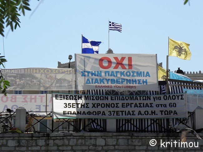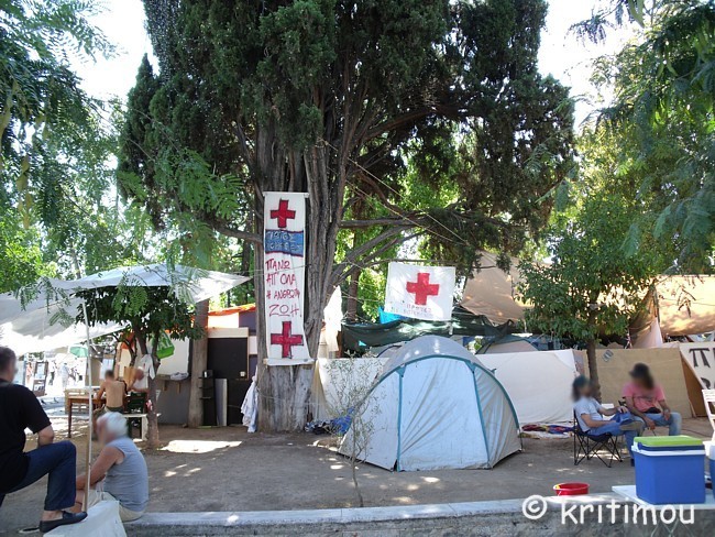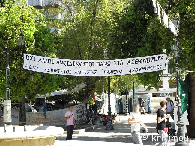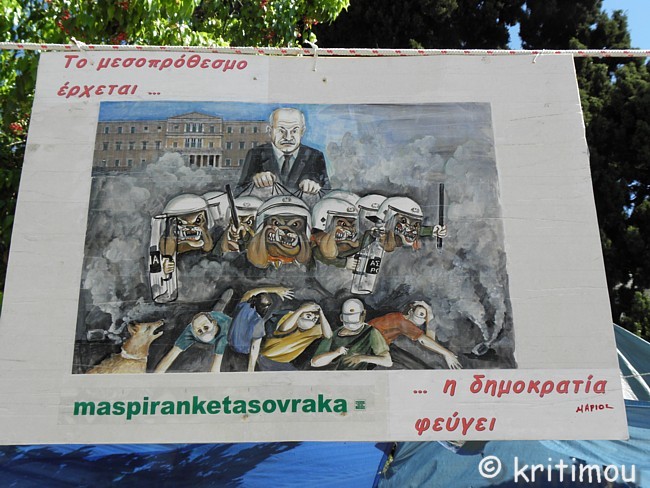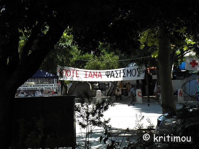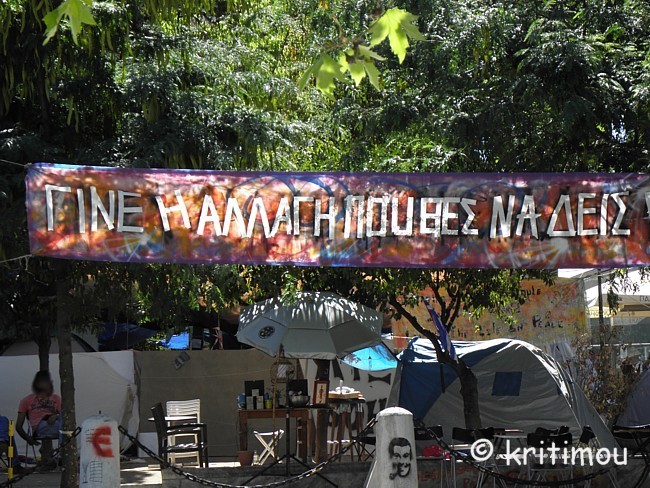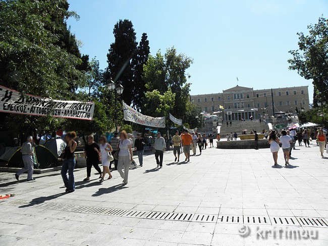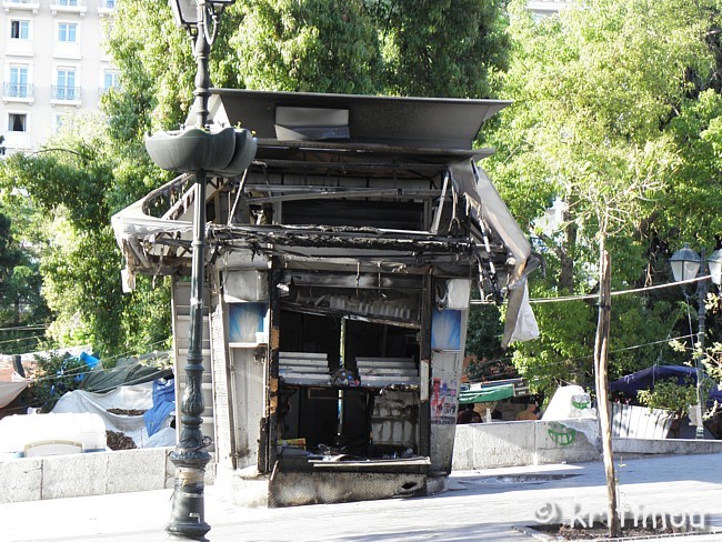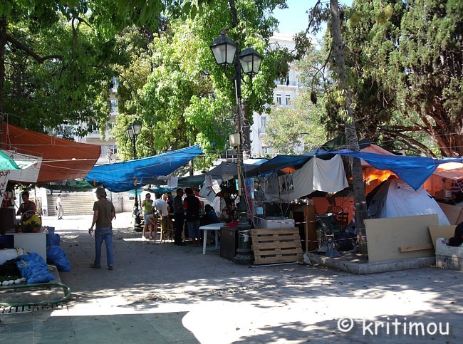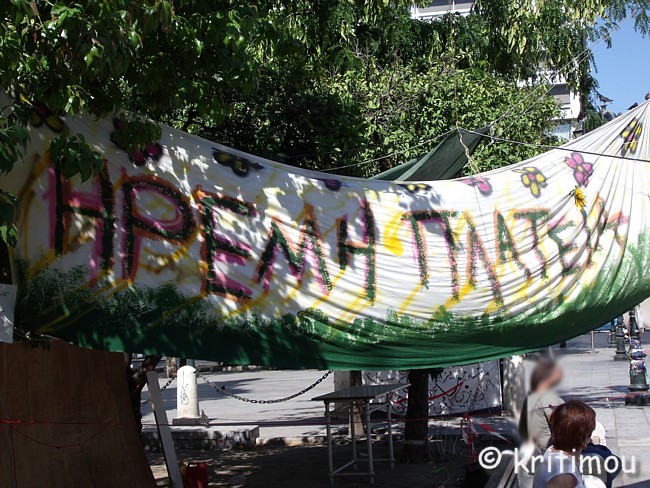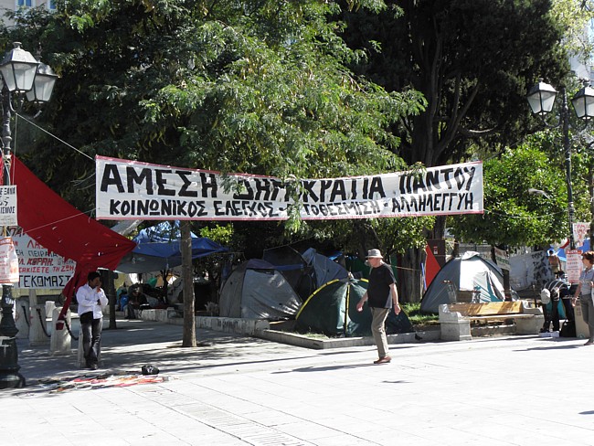 Tatsächlich haben wir keine Probleme gehabt, noch eine Nacht im Hotel Cecil hinzuzubuchen. Die Vorfreude auf den Museumsbesuch ist groß, als wir am frühen Vormittag zum nahen Syntagma-Platz spazieren. Doch zunächst wird unsere Aufmerksamkeit auf ein Widerstandscamp gelenkt, das im unteren Teil, also noch unterhalb der breiten Treppen, die zum Regierungsgebäude führen, errichtet worden ist. ![]() ![]() Zelte sind im Schatten unter den Bäumen aufgestellt. An einem Organisationsstand sind die Themen von Arbeitsgruppen (z.B. Rechtsberatung, Aktion Künstler, Obdachlose, Kochgruppe, Reinigung, Kommunikation, Deeskalation u.a.) auf einer Tafel angeschlagen. Daneben Tipps und Listen, was man benötigt, wenn man mitcampieren will. Man erhält den Eindruck, dass sich hier jeder politisch einbringen und mitdiskutieren kann. Auch eine Erste Hilfe ist organisiert. ![]()