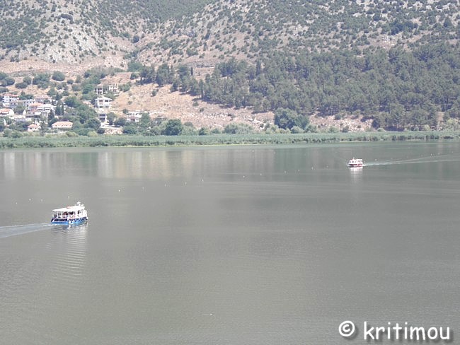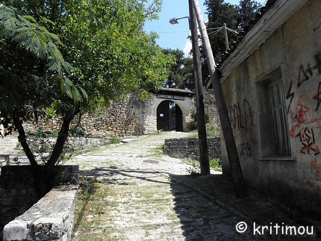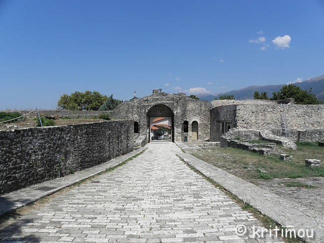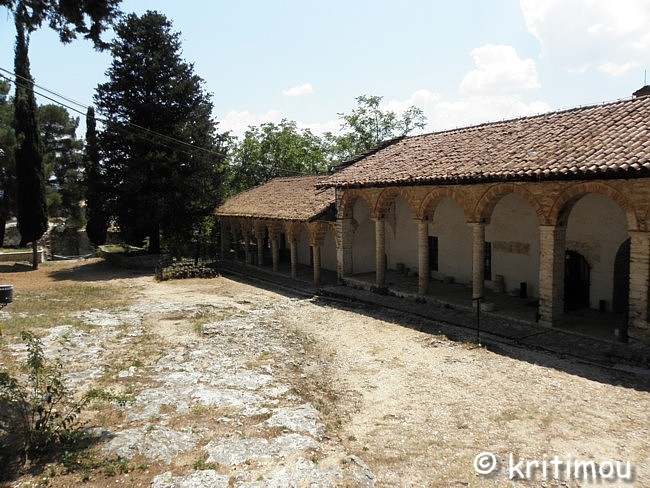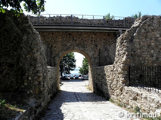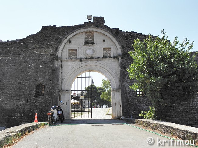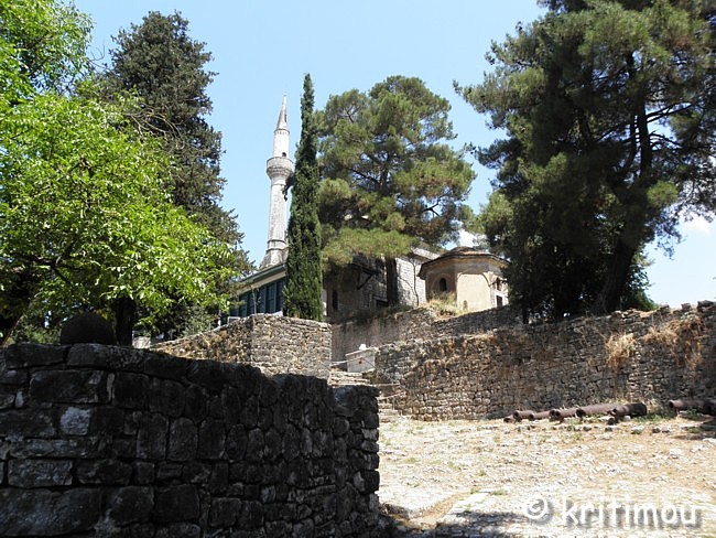 Das Gelände um die Aslan-Pascha-Moschee betritt man über einen leicht ansteigegenden, gepflasterten Weg, der durch ein weiteres Tor führt. ![]() Schräg gegenüber dieses Eingangs, an erhöhter Stelle, steht die imposante Aslan-Pascha-Moschee, die 1618 von Aslan Pascha erbaut wurde und seit 1933 das Dhimotikó Moussío (Städtisches Museum) beheimatet. ![]() Rechterhand befindet sich die Ruine einer alten Kirche. In einem umzäunten Käfig daneben wurden schwere Kanonenkugeln aus früherer Zeit deponiert. ![]() Von der Plattform am Eingang gewähren Lücken in der üppigen Vegetation weite Blicke in alle Richtungen auf den See und die Insel.