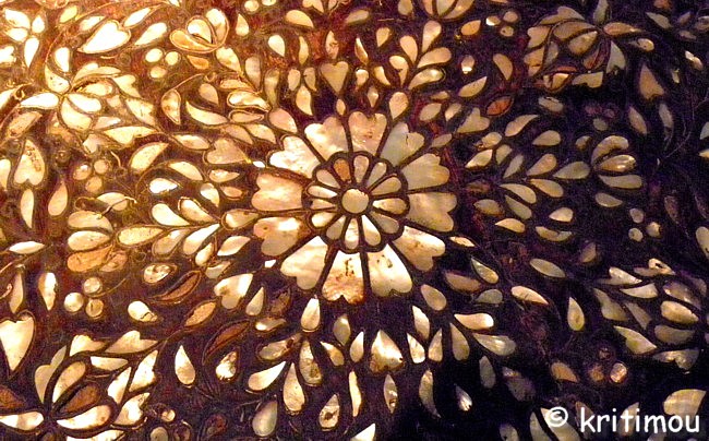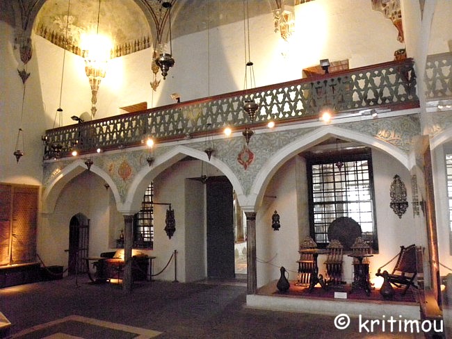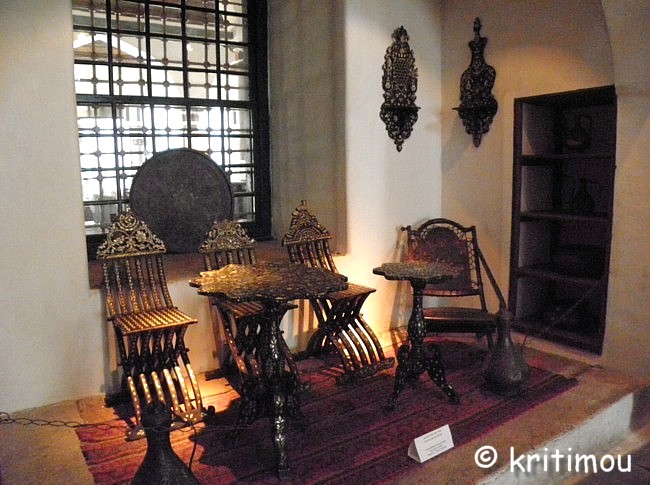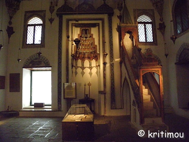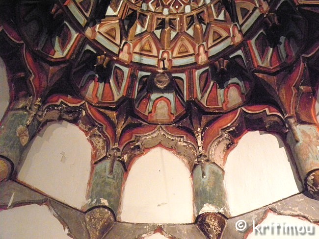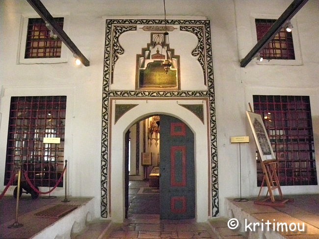 Muqarnas (Stalaktitengewölbe) am oberen Abschluss der Gebetsnische Im Vor- und Hauptraum gibt es viele Ausstellungsstücke zu bewundern, Geschenke wohlhabender Einwohner Ioánninas, die die drei großen Gesellschaftsbereiche von einst symbolisieren: die griechische (christliche), die osmanische (moslemische) und die griechische (jüdische) Gemeinde. Die meisten der Exponate der osmanischen Abteilung befinden sich im ehemaligen Gebetsraum, unter anderem Schmuckkästen und Truhen aus der Zeit Ali Paschas, Orientteppiche, kunstvoll verzierte Korane und eine Sitzgruppe aus Walnussholz mit wertvollen Perlmuttintarsien.