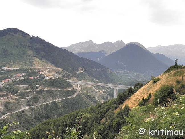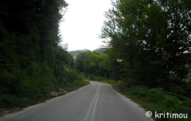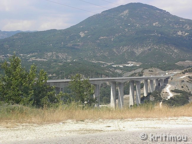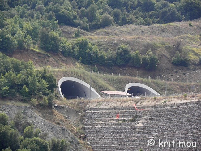 ![]() Seit der Eröffnung der Egnatía Odos (E 90), die sich kerzengerade und alle Hindernisse überwindend quer durch Nordgriechenland, von der türkischen Grenze bis nach Igoumenitsa, an der Adria, zieht und sowohl dem einheimischen als auch dem Transitverkehr eine Wahnsinns-Zeitersparnis beschert, ist die alte Straße nur noch für Liebhaber, Nostalgiker und (vorsichtige) Motorradfahrer offen. An manchen Stellen ist der Belag nicht mehr so gut, etwas abgesenkt, mit Rissen, doch im Großen und Ganzen immer noch problemlos befahrbar. Manchmal liegen auch herabgefallene Steine am Fahrbahnrand. ![]() Während wir durch die üppig grüne Bergwelt zuckeln wird deren Idylle ab und an von den weiß markierten, schräg in den Berg zementierten Tunneleingängen und Brücken der Egnatía durchbrochen.