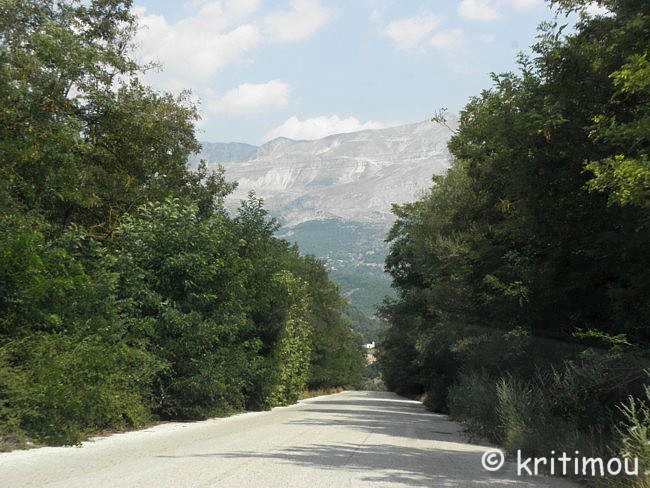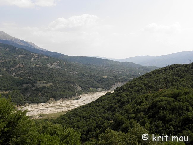 ![]() Schon etliche Dutzend Kilometer von Ioánnina entfernt, als die Straße einen weiten Schlenker nach Süden macht, stoßen wir auf das fast trockene, weite, weiß-glänzende Flussbett des Aráchtos, der in Zagóri entspringt und weiter südlich unter der Brücke von Arta hindurch dem Ambrakischen Golf entgegenfließt. ![]() Gerade als wir uns dazu entschieden haben, auf dieser wunderschönen Strecke noch weiter nach Métsovo zu fahren, lockt uns ein Schild (in Richtung Chrisovítsa) nach Norden, zum Aóos-Quellsee. Nach dem Abzweig führt die Straße gleich steil bergan, sodass mir schon bald die Ohren rauschen und der Kopf brummt. Auf einer ganz schmalen, aber asphaltierten Strecke passieren wir den Ort Chrisovítsa und fahren anschließend durch einen wunderschön saftigen Wald, der nur durch seine Nähe zum Wasser so dicht und grün sein kann. ![]() Irgendwann kommt uns ein mit Baumstämmen beladener LKW entgegen. Wir fragen, ob wir zur Aóos-Quelle auf dem richtigen Weg sind, und werden von dem netten Fahrer weiter gewunken. Die Piste ist bald nur noch von Schotter bedeckt, doch wenig später wieder asphaltiert. Immer höher geht es hinauf. An einem Platz, bei einer Kapelle, halten wir an. Würzig duftet die Luft, frisch und so richtig nach Wald. Üppige Farnfelder bedecken den Boden. Mitten in einem solchen Feld steht ein Brunnen, an dem eine Platte mit einer griechischen Aufschrift angebracht ist: