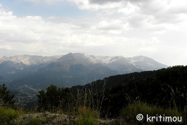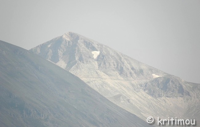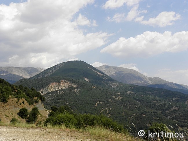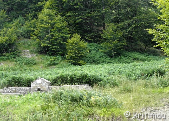 mit seinem Stock stieß er zu, und es quoll das Wasser dieses Brunnens. Kóstas Krystális ![]() Noch eine ganze Weile genießen wir die kühle Frische, atmen den Duft von Wasser und Wald, spüren die kühlende Feuchtigkeit auf der Haut. Nun sind wir erst recht gespannt auf den Quellsee und setzen unseren Weg bergan fort. Immer wieder geben jetzt Schneisen den Blick frei auf die Erhebungen der Gebirgswelt. Auf einer der benachbarten Bergspitzen vermeinen wir sogar noch etwas Schnee zu erkennen, und das im Hochsommer.