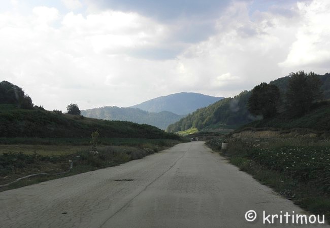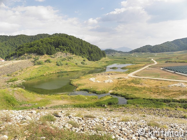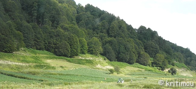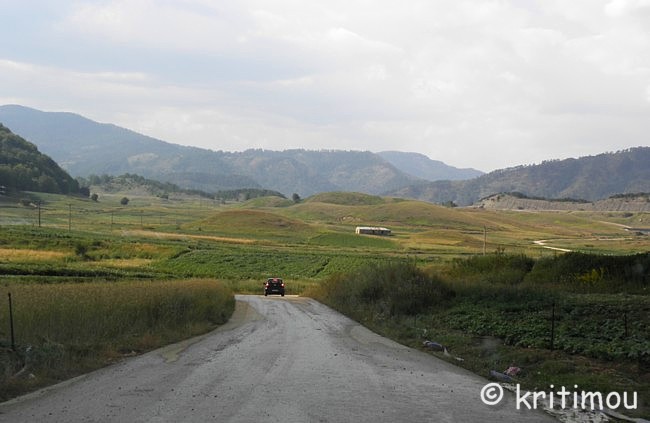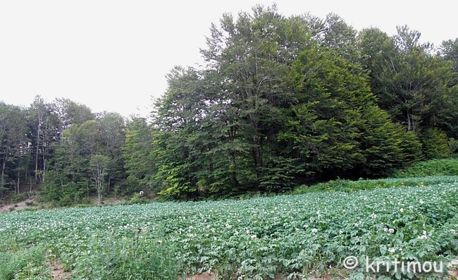 ![]() Etwa 10 km von Chrisovítsa entfernt erreichen wir schließlich eine Hochebene (Οροπέδιο Πολιτσές), überqueren über eine Brücke sumpfiges Gelände und gelangen in ein Gebiet mit Weiden und vielen Kartoffelfeldern, die gerade in voller Blüte stehen.
