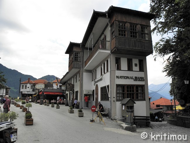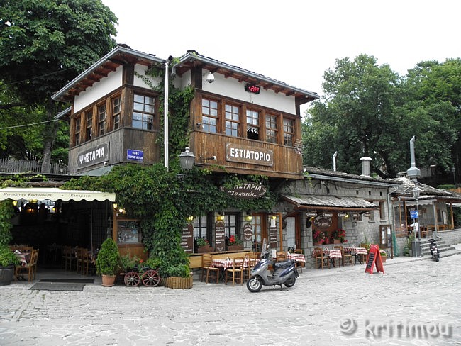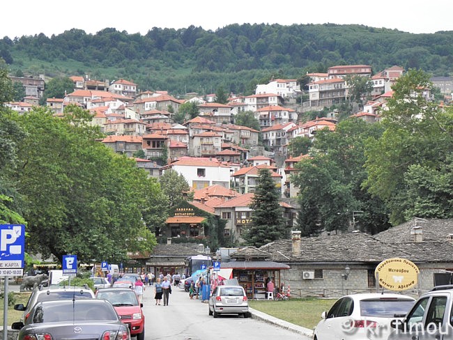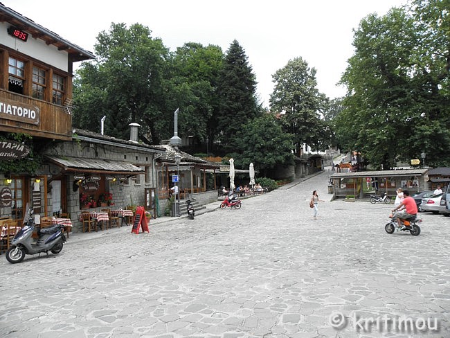 ![]() Auf der Weiterfahrt nach Métsovo brauchen wir nicht mehr den ganzen Weg zurück bis zur Hauptstraße zu fahren, sondern nur bis zum Ausgang der Ebene, biegen dort nach links ab, zunächst noch ein kleines Stück am See entlang und schließlich in Richtung des Bergdorfes. Durch eine friedliche Gegend rollen wir, weit und breit kein Auto und keine Menschenseele. Nur ein paar Schafherden grasen friedlich, von – aus der Ferne betrachtet – ebenso friedlichen Hütehunden bewacht. Ruhe und Einsamkeit in der Natur lassen das Herz eines jeden Wanderers höher schlagen. Auf dem weiteren Weg durch Ost-Zagóri begegnen uns schließlich ein paar Pferde, die sicherlich zu einem Gehöft gehören. Wenige landwirtschaftliche Gebäude stehen in Sichtweite. Schließlich treffen wir in Métsovo ein, kurven hinab ins Ortszentrum und parken das Auto auf dem zentralen Platz. Hier ist man gerade dabei, das jährliche Dorf-Panighíri vorzubereiten, die Musiker stimmen sich auf einer Bühne bereits ein, Einheimische füllen langsam die teilweise mit Stühlen bestückte Platía.