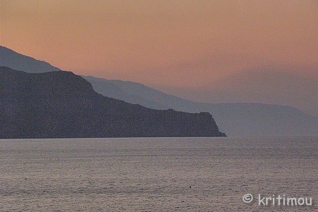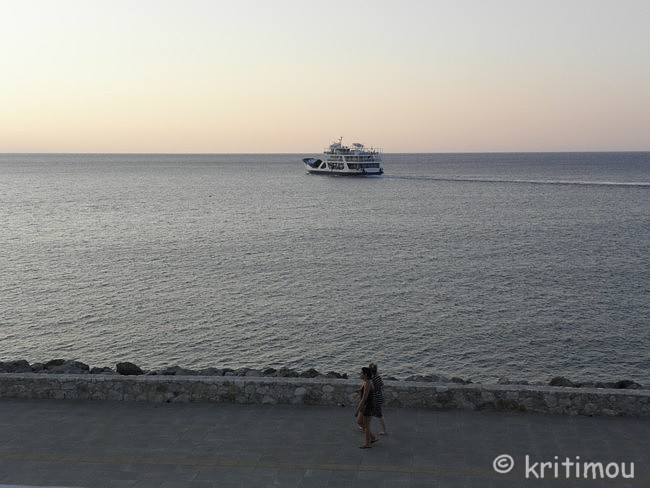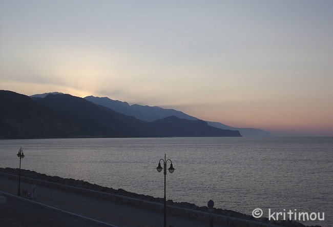 An unserem ersten Morgen auf dem schmalen Seitenbalkon ist Alex beim Kippeln auf einem der weißen Plastikstühle abgestürzt. Die Füße auf der Brüstung und den Kopf an der Hauswand zerbrach der Stuhl unter ihm plötzlich in mehrere Teile. Alex klappte dabei wie ein Taschenmesser zusammen und rutschte mit dem Kopf an der Hauswand entlang zu Boden. Sein Blick - plötzlich ganz starr. Erschrocken schreie ich mir die Seele aus dem Leib. Sofort kommt eine Reinigungskraft aus dem Nebenzimmer angerannt, alarmiert die Wirtsleute, besorgt in Handtücher geschlagene Eiswürfel. Alex – mittlerweile wieder zu sich gekommen – ist völlig benommen, als er sich langsam wieder aufrappelt, sich zum Bett schleift und die Eispackung auf seinen Hinterkopf legt. Es vergeht eine Stunde, in der ich hoffe, dass es nicht noch zu irgendwelchen Komplikationen kommt. Glück gehabt, weder Kopfschmerzen, Übelkeit noch sonstige Überbleibsel des Sturzes bleiben zurück. Die Stühle seien noch nicht alt und normalerweise würden diese auch alle zwei Jahre ausgetauscht, meint einer der Wirte. Allerdings entdecken wir auch auf den Sitzgelegenheiten des Balkons im Vorderzimmer, in das wir zwei Tage später umziehen, Risse, die bei Belastung genauso plötzlich zum Zusammenbrechen des Sitzmöbels führen können. Ab jetzt werden wir uns nur noch ganz vorsichtig darauf niederlassen, denn eine Veranlassung zum jetzigen Austausch der Stühle sieht man von Wirtsseite aus nicht. Die vergangene Nacht war kurz. Da wir uns die letzten Tage ausgedehnte Schlafeinheiten zugeführt haben, vielleicht auch, weil wir immer noch den bekloppten Pentosáli einer Tanzgruppe vom Vorabend im Kopf haben, sind wir gegen sechs Uhr morgens schon wieder auf den Beinen. Ein leckerer Kaffee auf dem Balkon ohne sichtbehindernde Markise und ohne Bullenhitze kommt jetzt genau richtig. Trotz anstrengender Sitzhaltung auf der vorderen Kante der Stühle haben wir uns schon auf den Sonnenaufgang auf unserem meerseitigen Balkon gefreut. Noch ist es ruhig. Die Samaria I liegt vor Anker, das Beladen mit den Schluchtenwanderern wird erst später vonstattengehen. Der Horizont hat sich schon rötlich verfärbt, immer noch dunkel und schemenhaft die Küstenlinie, die Wasseroberfläche spiegelglatt. Ein Fischerboot tuckert einsam von rechts nach links, während ein Kleppergaul mit einem Reiter auf dem Rücken müde über die Promenade trabt. Nur ganz wenige Passanten sind unterwegs, doch am Steinstrand johlen und toben ein paar junge Leute lebensfroh und ausgelassen im Wasser herum. Langsam verändern sich die Landschaftsfarben. Der Himmel über dem Meer hat mittlerweile einen Blauton angenommen, ebenso wie die Berge, die nun in klaren Konturen hervortreten. Schließlich zeigt sich ein winziger Strahl, ein kleines, aber intensives Leuchten.