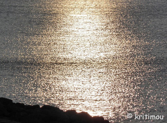 Genau an einer solchen Stelle kann man sehen, wie schnell die Erde sich dreht und die Zeit vergeht, denn innerhalb sehr kurzer Zeit ist die Sonne komplett hinter der Kerbe des Krokodilhügels aufgegangen, sticht sofort mit voller Wucht auf uns hernieder, taucht den Hafen in ein helles, realistisches Tageslicht und blendet mit der gleißenden Widerspiegelung der Strahlen auf der Meeresoberfläche die Augen, die sich immer noch nicht richtig öffnen wollen. ![]() Dieses irrlichternde und unwirkliche Glitzern im Gegenlicht, das sich nur durch das Verengen der Augen zu Schlitzen betrachten lässt, könnte den ein oder anderen großen Impressionisten zu einem Landschaftsgemälde inspiriert haben: mit halb geschlossenen Augen flirrende Olivenbaumblätter in pastellfarbenen Grün- und Grautönen malen; je nach Tageszeit und Witterung Braunklänge, Bleipfropfen oder Blau- und Türkistupfen für die Schattierungen des Meeres wählen und mit tausenden zartgelben oder blendend weißen Sonnen das sanfte Wellengekräusel garnieren.