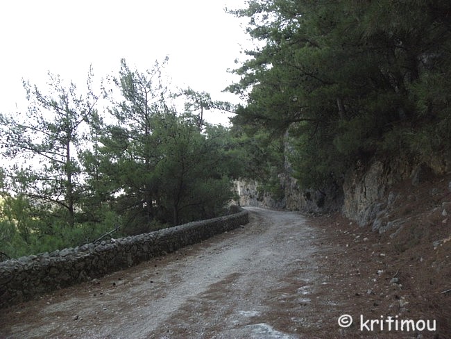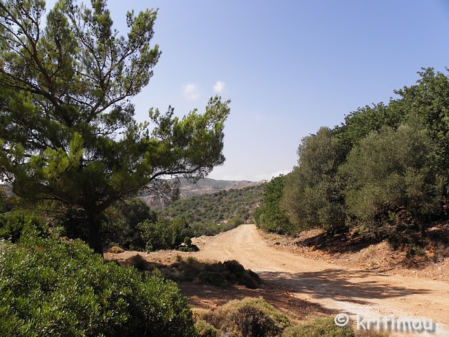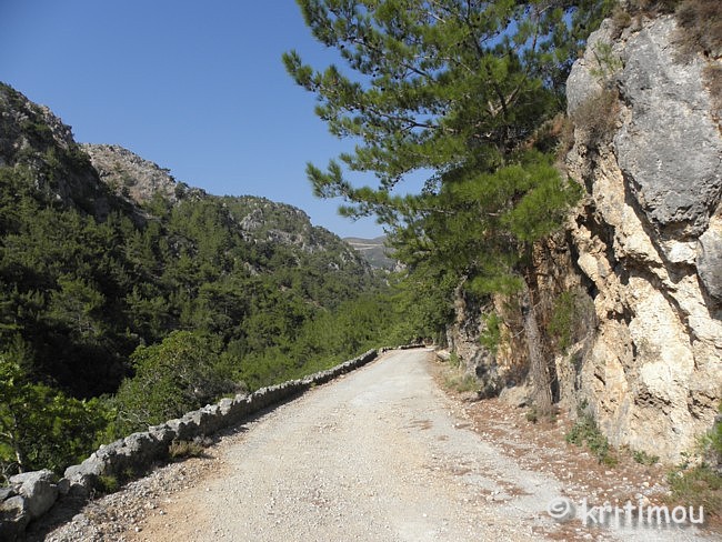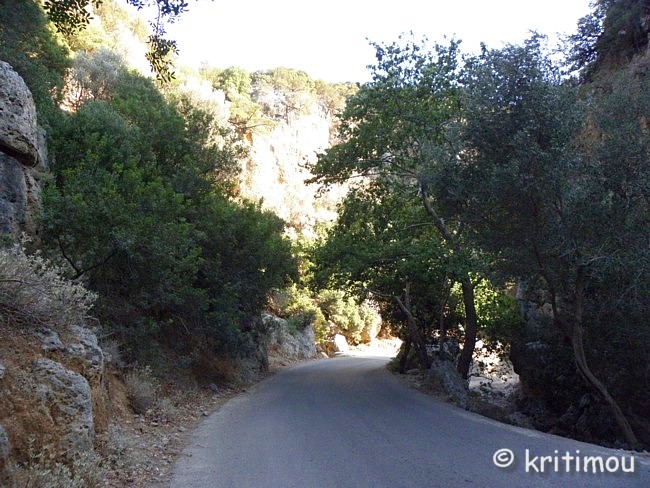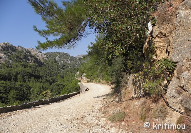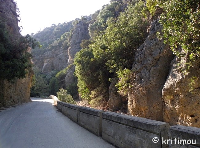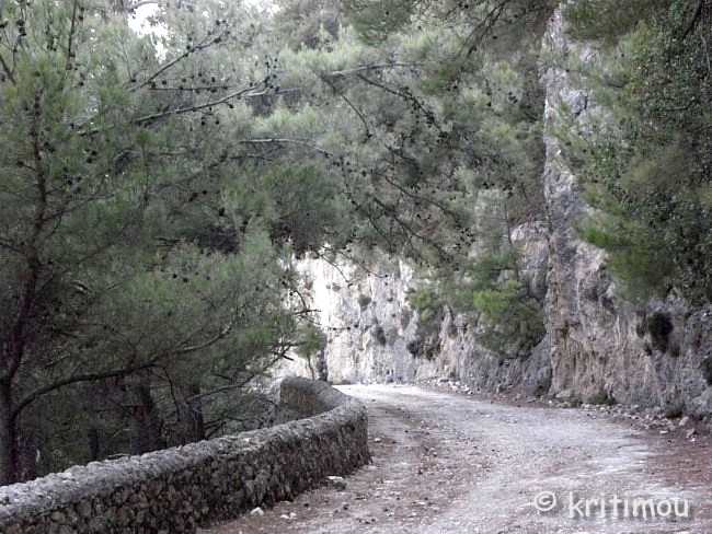 Historische Schlucht Ein Hinweisschild zur „Historischen Schlucht von Kándanos“ führt uns auf unserem weiteren Weg aus dem Olivenhain auf einen Schotterweg, dem wir in zahlreichen Kurven in die Landschaft hinein folgen. Niemand begegnet uns. Immer wieder halten wir an, um uns dem betörenden Kräuterduft hinzugeben. Unglaublich, diese Würze, die die Sinne fast vernebelt. Kreta halt eben! Zwischenzeitlich fragen wir uns, wo genau diese Schlucht nun ist, ob wir vielleicht doch falsch gefahren sind und wieso sie „historisch“ genannt wird. Das werden wir bald erfahren, als wir in ein Gespräch mit dem einzigen anderen Autofahrer geraten, der uns entgegenkommt, einem Mann aus Spína. Dieser Weg, so sagt er, ist die alte Straße nach Paleochóra. Er begrenzt die Schlucht, die wir aber erst im weiteren Verlauf der Strecke als solche erkennen werden, da wir nicht durch den Talgrund, sondern ziemlich hoch oben an ihrem Rand entlangfahren.