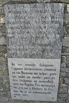 Besuch des Dorfes Die unerträglich schwüle Hitze des Vortages hat in den Morgenstunden ein aufgekommener starker Wind vertrieben, der unseren Unternehmungsgeist wieder geweckt hat. Vom Balkon aus erkennen wir weiße Schaumkronen auf den Wellenkämmen. Die Trägheit, die gestern über dem Ort lag, ist einer regen Geschäftigkeit gewichen. Am Vormittag brechen auch wir zu einem ersten Ausflug in die Umgebung auf. Es gibt Dörfer auf Kreta, deren Namen fest verwoben sind mit Ungerechtigkeit, Grausamkeit, Zerstörung und Tod, begangen von deutschen Nazis während des Zweiten Weltkrieges. Sie haben eine breite Spur von Verwüstungen hinterlassen. Um wieviel schöner und angenehmer ist es, Dörfer und Gegenden zu besuchen, die diesem Terror entronnen sind; in die wir als deutsche Touristen unbeschwert hineinfahren und uns an der Gastfreundschaft und der schönen Atmosphäre erfreuen dürfen. Immer wieder sind wir jedoch aufgefordert, diesen Spagat zu machen zwischen dem Paralleluniversum des Tourismus, der alles, was negativ ist, versucht auszublenden und den Hinterlassenschaften der deutschen Nazis, mit denen wir immer wieder konfrontiert werden. Insbesondere in den „Märtyrerdörfern“, die besonders unter der Nazi-Okkupation zu leiden hatten, kommt man um die Auseinandersetzung nicht herum. Kándanos ist ein solches Dorf. Auch wenn die Bewohner nach dem Krieg wieder dorthin zurückkamen, darf das, was dort geschehen ist, nicht vergessen werden.