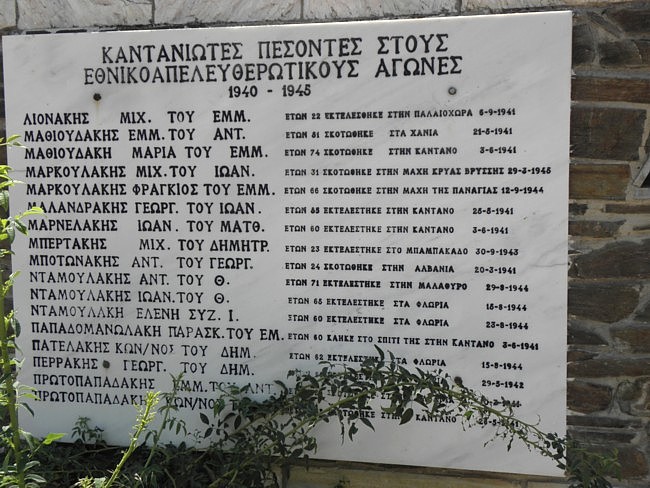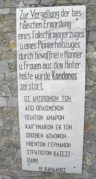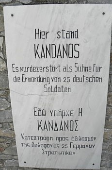 „…zerstört vom Grund her, um niemals wieder aufgebaut zu werden“ Die Geschichte beginnt mit der Schlacht um Kreta ab dem 20. Mai 1941. Ziel eines deutschen Trupps war nach der Landung der Hafenort Paleochóra. Ihre Route führte durch eine Schlucht zwischen Flória und Kándanos, in der es am 23. und 24. Mai zu einer Schlacht mit Bewohnern der Umgebung kam, die den Durchzug der Eroberer nicht einfach hinnehmen wollten. Einige deutsche Soldaten verloren dabei ihr Leben. Wie so häufig kam es in der Folge zu grausamen Rachehandlungen seitens der Besatzer, in diesem Fall am 31. Mai 1941 vom verantwortlichen, kommandierenden General Kurt Student befohlen, der nach dem Krieg für keine seiner Taten zur Rechenschaft gezogen wurde. Als Vergeltungsmaßnahmen wurden unter anderem „Erschießungen“, das „Niederbrennen von Ortschaften“ und „die Ausrottung der männlichen Bevölkerung ganzer Gebiete“ ausgegeben. Dabei sei „planmäßig“ vorzugehen und „alle Maßnahmen mit größter Beschleunigung durchzuführen, unter Beiseitelassung aller Formalien und unter bewusster Ausschaltung von besonderen Gerichten“. In der Folge dieses Befehls wurde Kándanos am 3. Juni zerstört. Griechen war es unter Androhung der sofortigen Erschießung für immer verboten, die Ruinen zu betreten. Tafeln wurden aufgestellt, als Warnung und Zeichen der Stärke der Besatzer. Diese sind im Original erhalten und bilden das Zentrum eines kleinen Museums im Ort. Nachbildungen stehen als Mahnmal auf dem Dorfplatz, begleitet von einem Hoffnungsappell der Gemeinde Kándanos, dass Symbole wie diese in der Zukunft nie wieder Verwendung finden mögen.