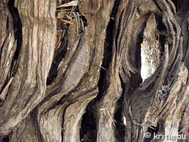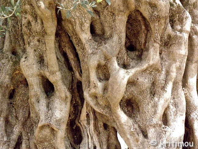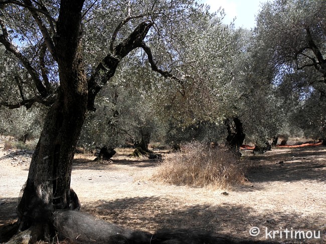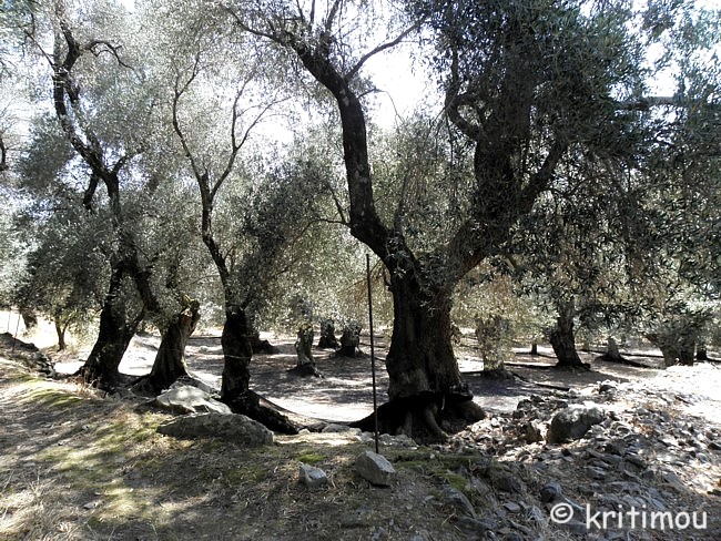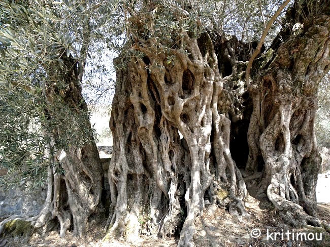 Seine Maße können sich sehen lassen: Der Durchmesser beträgt 6,85 Meter, der Umfang über 18 Meter. Er gehört zu den Dekaochtoúres, so genannt wegen der Ertragsfähigkeit von mindestens 18 Mistata zu je 12 Litern, insgesamt also etwa 220 Litern Öl pro Jahr. Heute, im hohen Alter, erträgt er immer noch 80 bis 100 Liter. Ähnlich wie der wahrscheinlich älteste Ölbaum Kretas bei Ano Vouvés (südlich von Kolymvári), gehört er zur Sorte „Tsounáti“, der ehemals auf einen wilden Olivenstock aufgepfropft worden war. Dieses Kulturdenkmal steht jedoch nicht für sich allein, es ist lediglich herausgehoben aus einer großen Dichte alter Baumriesen, die alle nicht wesentlich jünger erscheinen. Wie angenehm die Atmosphäre dieses altehrwürdigen Hains die Sinne berührt, der Duft der erhabenen Bäume die Nase kitzelt, seine silbrig-grünen Blättchen von leichten Brisen gestreift sich leicht bewegen, begleitet von einem ortsansässigen, erfahrenen Zikaden-Orchester. Zum Teil sind Netze unter den Bäumen ausgelegt; eine große Ernte scheint man in diesem Jahr jedoch auch hier nicht zu erwarten.