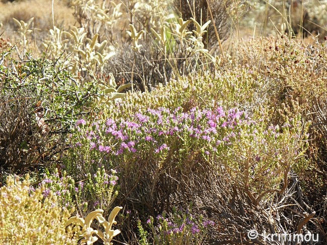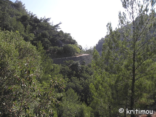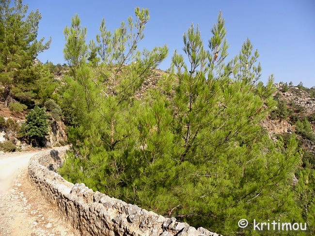 ![]() Für uns besteht die außergewöhnlich Schönheit dieses, etwa sieben Kilometer langen Weges in der Wahrnehmung der betörenden Düfte, die die kräuterbewachsenen Hänge verströmen. ![]() Salbei, Thymian, Thrymba, neben den vielen, nicht essbaren, aber auch sehr wohl duftenden Pflanzen. Kiefern, hellgrüne Péfka, sorgen für lichte Momente in den dunkelgrünen bis mauve-farbenen Schattierungen der Hügel. ![]() Ein Meer von Wohlgerüchen, ein Fest für die Sinne und für uns Vorfreude auf die Speisen, die wir zu Hause mit den gepflückten Kräutern zubereiten werden. Unsere Pflücktechnik soll möglichst schonend sein: immer nur ein paar Zweige eines Busches, NIE die Wurzel ausreißen und genug übrig lassen für Bienen und Ziegen und vielleicht noch andere Menschen, also kein Plündern der Sträucher. Nach der kleinen Pflückaktion sind unsere Finger richtig harzig. Diese intensiven Düfte übertreffen jede Vorstellung von Wohlgeruch in der Natur. Man erhält das Gefühl, fernab jeglicher Zivilisation zu sein, obwohl die nächste Hauptstraße nicht weit entfernt liegt. Kein Wunder, dass man den lokal hergestellten Käse oder Honig kiloweise verschlingen möchte, so würzig reizen die von Ziege und Bienen verarbeiteten Kräuter die Geschmacksnerven. Viele Sträucher sind zu dieser Jahreszeit schon sehr trocken, von der intensiven Sonneneinstrahlung während der Sommermonate richtig ausgedorrt und mit Staub überpudert. Wie intensiv müssen die Gerüche erst sein, wenn der erste Regen im Herbst herniedergeht! Überall auf Kreta, wo wir bisher waren, spricht man vom Wassermangel aufgrund des fehlenden Regens des letzten Winters. Hoffen wir, dass die kommende Feuchtsaison mehr Niederschläge bringt und alles wieder ins Lot kommt. Der Weg führt nun zwar stetig, aber nie richtig steil bergan. An der höchsten Stelle bietet sich uns ein großer Teil der Schlucht dar und man kann ermessen, wie mühselig es gewesen sein muss, die Steine zur Befestigung der Straße (eventuelle vom benachbarten Steinbruch) hierherzuschleppen und zu platzieren. Die begrenzende Mauer ist an einigen Stellen arg ramponiert, wohl von den Naturgewalten, die für gewöhnlich im Winter in Form von niederstürzenden Wassermassen hier wüten.
