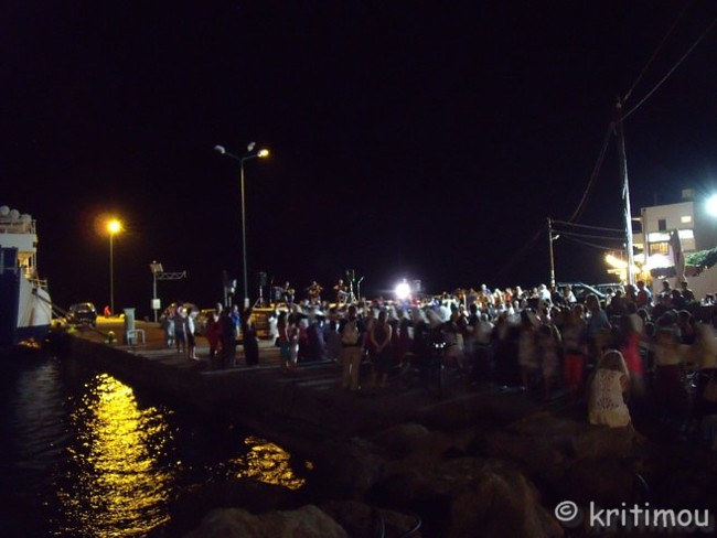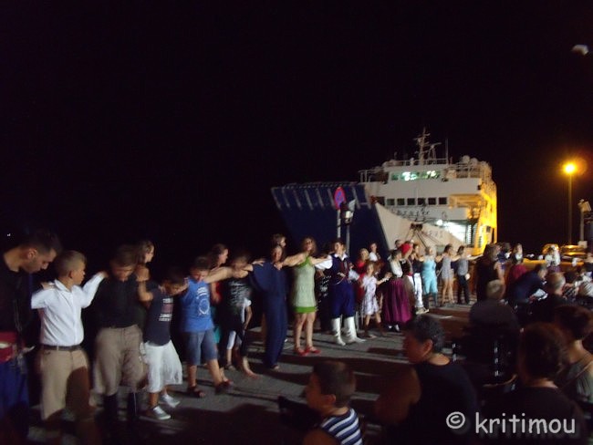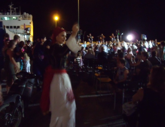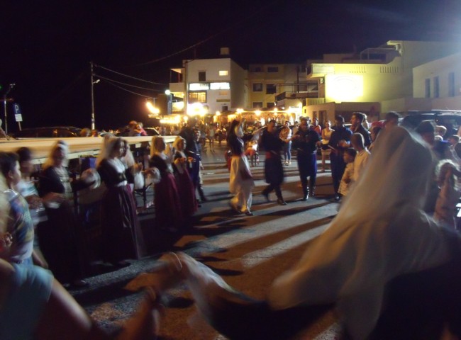 ![]() Schließlich erreichen wir eine Weggabelung (Paleochóra/Sarakína) an einer Brücke, die ihr Gewicht interessanterweise über einen gotischen Spitzbogen ableitet. Der Fluss tief darunter scheint noch etwas Wasser zu führen, zumindest vermeinen wir, ein leichtes Plätschern zu hören. Steile, steinige Berghänge mit unzähligen Höhlen und teilweise bizarren Formen begleiten uns ab hier wieder in Richtung Paleochóra. ![]() Von oben fahren wir schließlich wieder in den Ort hinein, der in seiner malerischen Halbinselform ausgestreckt vor uns liegt. ![]() Jetzt aber schnell das Auto abgestellt, rein in die Badeklamotten und zur blauen Stunde am Oststrand ins Meer, wo die dicken Kiesel von der Tagessonne noch so richtig warm sind, sich die Wasserfarbe in ein gelbliches Hellblau gewandelt hat. Kaum ein Wellenschlag ist zu spüren, Ruhe ist eingekehrt. Das Wasser ist so klar, dass man jeden Kiesel auf dem Grund einzeln sieht, selbst ohne Brille und mit Kurzsichtigkeit geschlagen. Beim Hinausschwimmen in dieses schwerelose Blau macht sich ein Gefühl von Leichtigkeit und Freude breit. Langsam taucht das Spätnachmittagslicht die Felsvorsprünge der Küstenlinie in Richtung Soúghia in sein warmes Rot und die Schatten werden länger. Und später, die Sonne ist längst untergegangen, verschwimmen die Konturen der Felsen zu weichen Blautönen, während die nun spiegelglatte Meeresoberfläche die hellbraunen Farben des Himmelslichts angenommen hat. Nach dem Abendessen schlendern wir zum Hafen, wo schon von weitem Musik zu hören ist. Die Laternen der Ostpromenade beleuchten matt die Vorbeiflanierenden, die den frühen Samstagabend genießen, jetzt, wo die Hitze des Tages geschwunden ist. Die Samaria I liegt wie jeden Abend im spärlich erleuchteten Hafen vor Anker. Geladen hat der Traditionsverein des Bezirks Sélino. Jugendliche und Kinder in Trachten tanzen zu den Klängen eines Trios, bestehend aus zwei Laoútos und einer Violine, wobei der Violinist auch dazu singt. Er lässt dermaßen den Bogen über die Saiten schrappen, dass man mit geschlossenen Augen meint, eine Lyra zu hören. Das dargebotene Repertoire ist kretisch mit vorwiegend schnellen Rhythmen. Für die Zuschauer hat man Stuhlreihen vor dem Bühnenpodest mit Blickrichtung Meer aufgestellt, mit genügend Platz für die Tänzer dazwischen.