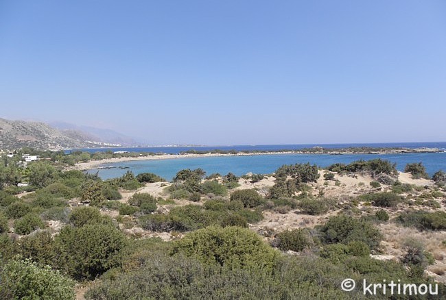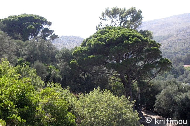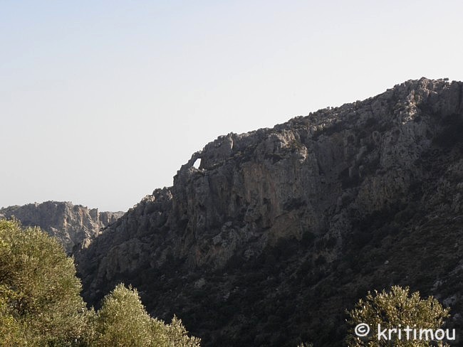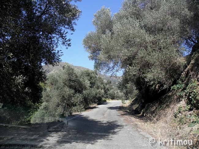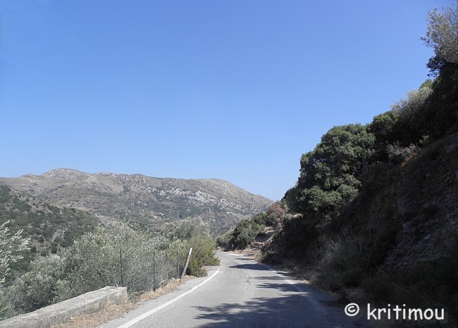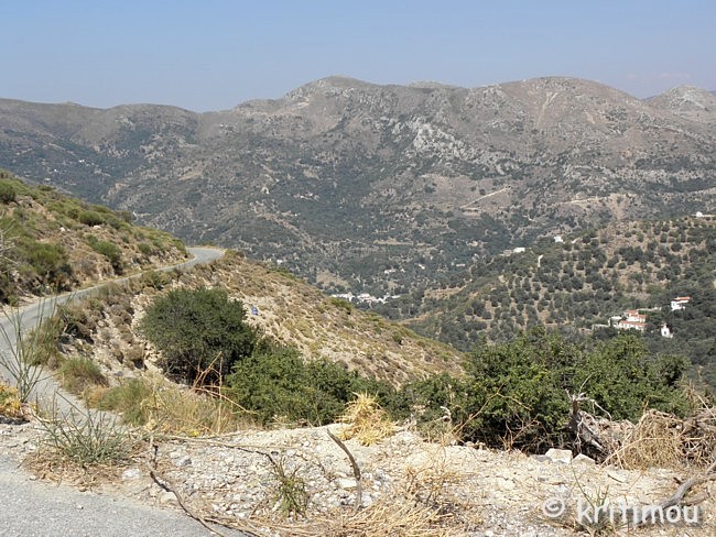 Für den Nachmittag haben wir uns einen kleinen Ausflug vorgenommen: von Paleochóra zunächst bis Ghialós, dann hinauf in die Berge nach Sklavopoúla, weiter nach Voutás und schließlich wieder zurück. Hinter Paleochóra geht es nach Westen hin zunächst an der Küste entlang. Noch weitere, fast menschenleere Kiesstrände laden zum Baden ein. ![]() In Ghialós biegen wir ab in eine Hügellandschaft, vorbei an einem kleinen Stausee und durch ein Gebiet mit Treibhäusern. Die Straße führt über den zunächst schattenlosen Hang in vielen Kurven nach oben. Ein außerordentlich heißer Wind weht durch die Autofenster herein. Im Weiteren wird die Straße schmaler, die Landschaft abwechslungsreicher und gewährt uns Blicke in tiefe Täler und auf die hohen Kuppen der weißen Berge.