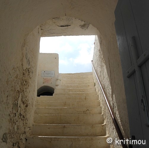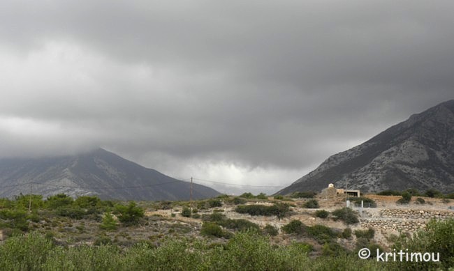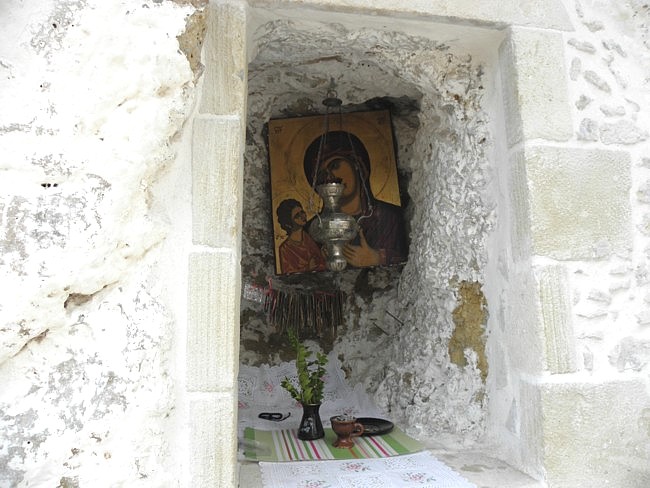 Wir stellen das Auto auf einem Parkplatz vor dem Eingang ab und betreten das Klostergelände, passieren ein kleines dazugehöriges Museum und steigen schließlich ein paar Stufen empor zur Kirche. Der Name Chrissoskalítissa bedeutet im Grunde Panaghía der goldenen Stufe. Somit ist das Kloster der Panaghía gewidmet (Orthodoxer Feiertag am 15. August), ausgehend vom Fund einer Ikone der entschlafenen Gottesmutter in einer Felsnische der Umgebung. Eine Andeutung befindet sich auf dem Weg hinauf zum Kirchengelände. ![]() Die Legende besagt, wer ohne Sünde ist, erblicke die goldene Stufe einer Treppe, die zum Kloster hinaufführt. Tatsächlich, so heißt es, bestand die letzte der 98 Stufen, die das Kloster bei seiner Errichtung hatte, aus purem Gold, die unter der osmanischen Besatzung abgebaut und verkauft wurde. ![]() Die Kirche ist außen und innen in schlichten Farben gehalten, Beige- und Brauntöne mit vergoldeten Accessoires. Bis zum 15. August, wenn das Namensfest hier gefeiert wird, ist es nicht mehr lange. Etwas Blumenschmuck ist dafür schon angebracht worden. Leider können wir uns nicht lange hier aufhalten, denn die Hitze im Kircheninnenraum steht förmlich. ![]() In anderen Gebäudeteilen sind kleine Museen untergebracht, wo Ikonen und liturgische Gegenstände ausgestellt sind. Am besten gefällt mir das Folkloremuseum. Die Einrichtung der winzigen Räume ist der früheren Lebensweise hier nachempfunden. Man könnte fast glauben, die Bewohner seien nur kurz mal außer Haus, so lebendig ist die Gestaltung. ![]() Im hintersten, kleinsten Räumchen gab es auch eine Geheimschule, in der die Mönche, wie in anderen Klöstern Griechenlands, griechische Kinder während der Osmanischen Besatzung unterrichteten, damit die griechische Kultur nicht verloren ginge. ![]() Während unserer Besichtigung haben sich die Wolken über den nahe gelegenen Bergen immer mehr verdunkelt. Weiter rückt die Regenfront jedoch nicht vor. ![]() Von der schwülen Hitze erschöpft, setzen wir uns auf dem Parkplatz noch ein wenig auf ein Mäuerchen unter einer großen, schattenspendenden Kiefer. Besucher kommen und gehen. Zwei dicke Pfirsiche tun uns jetzt gut, die wir von einem Pickup-Verkäufer erstehen. Danach verlassen wir das Klostergelände und fahren durch das Kastanien- und Olivenland wieder zurück, das wir von unserer Anreise nach Paleochóra her schon kennen. Die vorherrschende Landschaftsfarbe ist Grün. Eine Mischung aus Oliv-, Lind-, Flaschen-, Maien-, Gras-, Jade-, Smaragd- und Silbergrün. Alle Schattierungen sind in diesem Bild enthalten, ein verschwenderischer Überfluss. Bei Plemenianá kehren wir wieder an der alten Wassermühle „O Milos“ ein. Die idyllisch gelegene Taverne hat, was das Essen angeht, einen sehr guten Ruf. Wir verzehren jedoch nur Getränke: einen Frappé und einen gemischten Kräutertee, der bei den immer noch hohen Temperaturen gerade richtig kommt. Die Tische im Außenbereich stehen in einer Reihe in einer Straßenausbuchtung auf der gegenüberliegenden Seite des Gebäudes, neben einem schmalen Bach. Eine große Voliere mit verschiedenen Vögeln lädt zum Besuch ein; der angrenzende Kinderspielplatz wird gerade von herumplärrenden Halbwüchsigen belagert. Schade, ohne die Herumgrölerei wäre es sicherlich noch idyllischer. Tagesausklang In Paleochóra kommen wir bei wolkenlosem Himmel an, knallen das Auto in eine Parklücke, eilen zum Steinstrand zu unserem obligatorischen Abendbad und stürzen uns in die schon recht kühlen Fluten. Ein bisschen gestrampelt, und schon wird es wieder warm. Beschaulich ist es am Abend wieder geworden, und wunderbar, in dem glasklaren Wasser über den bunten Kieseln zu baden. Im Kopf sind wir aber immer noch in Elafoníssi. Ach, wie genießen wir unseren Urlaub! Das Kulturprogramm bei göttlichen Sousoukákia Smirneïka (selbstgemachte Hackfleischrollen mit Koriander in Tomatensoße) bestreiten am Abend wieder die beiden Rembétes. Später müssen wir noch den Spott unseres Vermieters über uns ergehen lassen. „Wie geht es euch“, fragt er. - „Wir sind geschafft!“ – „Wieso, habt ihr aufm Acker gearbeitet?“ – „Nein, wir waren in Elafoníssi...“ – „Doch nicht etwa von Sklavopoúla aus? Von dort geht man besser zu Fuß! Harharhar…“