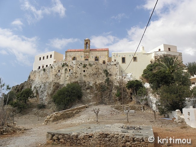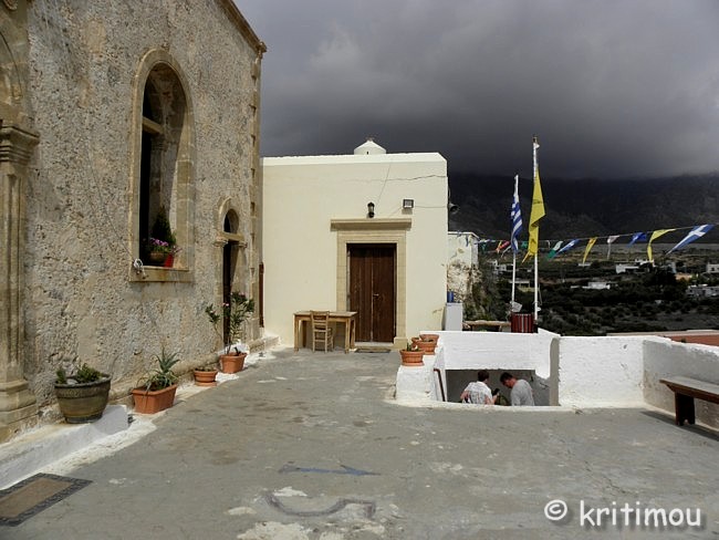 ![]() Wenn wir schnell fahren, können wir in einer dreiviertel Stunde in Paleochóra sein. Doch wir haben ja Zeit und genießen die Fahrt an sich, langsam, an exponierten Stellen mit kleinen Pausen, manchmal ein Foto wert. Immer mehr Wolken ziehen über den Bergen auf. Dort ist es sicherlich nicht so heiß wie hier. Nur wenige Kilometer von Elafoníssi entfernt liegt ein noch bewirtschaftetes Kloster mit langer Tradition. Auf einem Felsen errichtet wirkt es schon von weitem wie eine Festung.