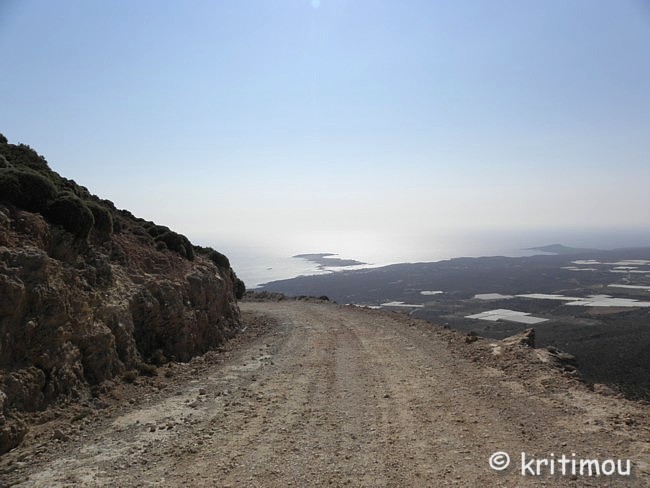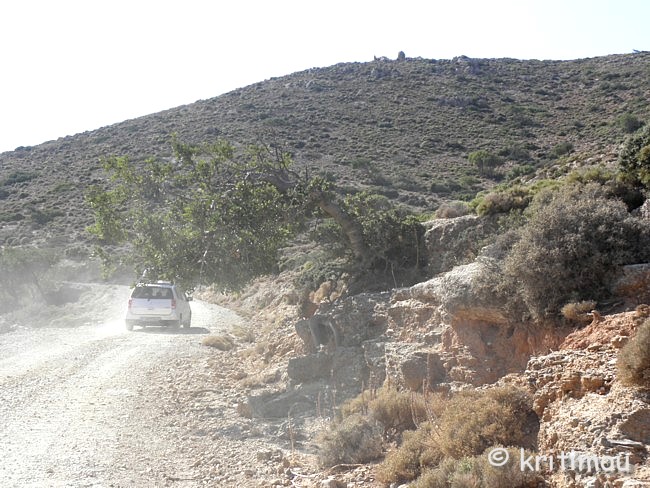 ![]() Als wir uns im Schneckentempo immer weiter bergab quälen, wird es zunehmend heißer. Bei heruntergelassenen Scheiben und Windstille gibt unser Fahrstil auch keinen Fahrtwind her. Anyway, die Piste führt in steten Kurven beharrlich talwärts. Weit kann es jetzt nicht mehr sein, denken wir nach jeder Kehre. So schwitzen und ächzen wir langsam bergab, bekreuzigen uns innerlich immer wieder und beten zu allen griechischen Schutzheiligen, dass die Reifen halten und wir uns nicht versehentlich den Unterboden aufschlitzen. Kaum auszumalen, würden wir hier in der Pampa liegen bleiben und dann zig Kilometer in sengender Hitze zu Fuß laufen müssen, um Hilfe zu organisieren. ![]() Unsere Gebete werden erhört. Als wir fast am Ende des Serpentinenweges angelangt sind, erblicken wir ein trockenes Flussbett mit ein paar grünen Pflänzchen und auf einem Hügel einen einzigen Baum. ![]() Ein Auto mit einem jungen italienischen Paar kommt uns entgegen. Alex hält sie an und gibt eine Warnung ab. Beide lächeln, bedanken sich artig und fahren weiter, die Holperpiste bergan, ohne Jeep. Nun ja, junge Leute halt. Bevor wir wieder auf Meereshöhe ankommen, können wir die Insel Elafoníssi mit der sandigen Verbindung zum Festland schon erkennen. Die Vorfreude auf ein ausgiebiges Bad im Meer wächst mit jedem Meter. ![]() Endlich streben wir nun mit normaler Fahrgeschwindigkeit unserem Ziel zu, dem angeblich schönsten Strand auf Kreta, nachdem wir auf den zweitschönsten – Bálos auf Gramvoússa – nach einer qualitativ vergleichbaren, nur wesentlich kürzeren Holpertour kurz vor dem Ziel verzichtet haben. Am Strand von Elafoníssi Was für ein Gefühl, als wir ebenerdig die Treibhaus-Landschaft in der Ebene hinter uns gelassen haben und nun geradeaus in Richtung Strand brettern.