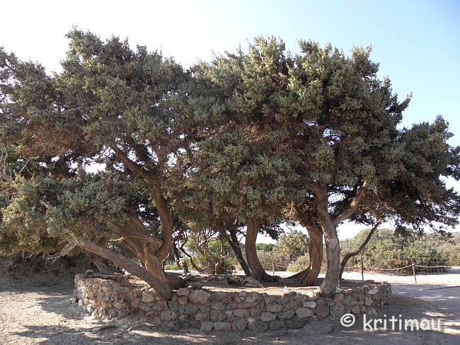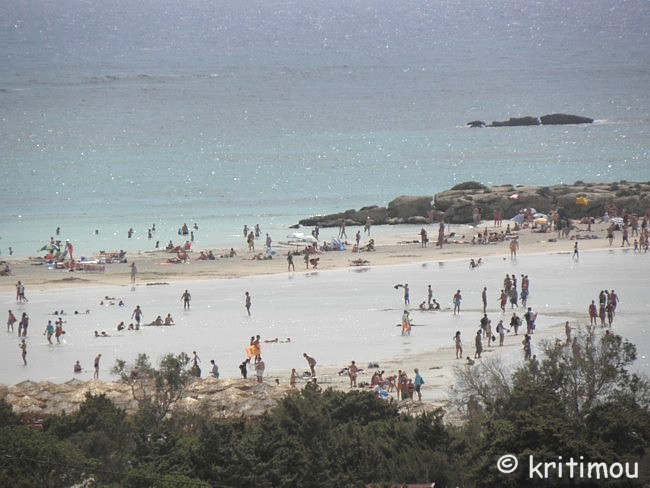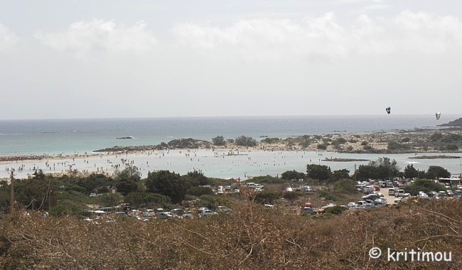 ![]() Auf dem Parkplatz finden wir sogar noch ein halbwegs schattiges Plätzchen. Flugs verlassen wir die Karosse und streben dem Strand zu, dem schönsten, eigenartigsten, wunderbarsten Strand Kretas. Genauso empfinden auch tausende andere Badewillige, die allerdings über einen anderen Zufahrtsweg, eine asphaltierte, breite Straße, hierhergekommen sind.