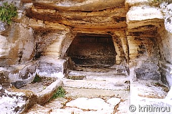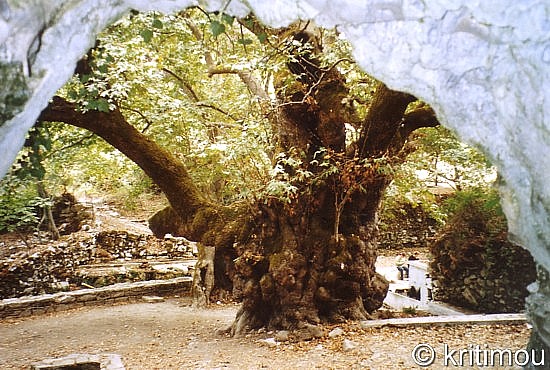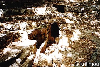 An dieser Stelle befand sich wohl das Zentrum mit Hunderten von Gräbern. Linkerhand steht eine recht unscheinbare, weiß getünchte Kapelle, die man über wenige Steinplatten auf einer erhöhten Plattform erreicht. Es handelt es sich um die Kirche der fünf Jungfrauen, die als Märtyrerinnen für ihren christlichen Glauben gestorben sind. In der Kirche hat man ein Familiengrab mit fünf Sarkophagen gefunden, die bis ins 4. vorchristliche Jahrhundert datieren. Vielleicht standen sie in der angrenzenden Höhle im rückwärtigen Teil der Kirche. Die hölzerne Altarwand ist auch hier dem Anlass entsprechend sehr reich mit Schnitzereien verziert. Auf der links außen eingearbeiteten Ikone sind die Namen der 5 Jungfrauen über ihren Abbildungen aufgeführt, die ich als Thékla, Enathá, María, Mártha, Mariámni entziffere. Verlässt man das Kirchengelände durch den rückwärtigen Teil, sieht man wiederum eine Reihe von angelegten und gut erhaltenen Höhlengräbern. Dort befindet sich der mächtige Stamm einer angeblich 2000 Jahre alten, riesigen Platane. Unglaublich: als die christliche Zeitrechnung begann, gerade um die Zeit, als die Römer den lappäischen Stadtstaat erobert hatten, soll dieser Baum sein Wachstum begonnen haben. Wie viele Generationen von Menschen seitdem hierher gepilgert sind? ![]() Rings um die Platane hat man einen kleinen Rastplatz angelegt. Wasser aus einem Brunnen führt durch Äquadukte weiter talwärts. Gegenüber, im Felsen, sind weitere Grabhöhlen angelegt. Beim Herumklettern trete ich auf eine lose Platte, deren schepperndes Geräusch über einem Hohlraum erahnen lässt, dass das gesamte Gelände im Unterbau vielleicht von einem größeren Höhlensystem durchzogen ist. Hier sehe ich auch die mit Abstand größte Höhle, in der ich aufrecht stehen und nun die majestätische Platane von einem erhöhten Standpunkt aus begreifen kann. Später folge ich dem Weg noch ein Stück, doch der Platanenplatz scheint der sichtbare Endpunkt von Nekrópolis zu sein. Nach einer längeren Pause lasse ich auf dem Rückweg nochmals eine zweitausendjährige Geschichte an mir vorüberziehen und weiß, dass ich unbedingt wieder hierher kommen möchte. Viele Punkte auf meiner Karte habe ich noch nicht gefunden, so dass es sich sogar lohnt, gleich für mehrere Tage in Argiroúpolis zu bleiben. |