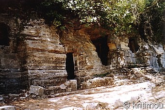 Ich verlasse hier also die Straße und folge einem unscheinbaren Weg, der nach kurzer Zeit wiederum die Hauptstraße kreuzt, wie man an der Wegführung des blauen Pfeiles auf der Zeichnung entnehmen kann. Hier nun befindet sich die einzige Markierung, ein verrostetes Schild, das den Weg zu den "Fünf Jungfrauen" (in die Totenstadt) weist. Jemand, der nicht ortskundig ist, der nicht nach dem Weg gefragt hat und der auch nicht weiß, wofür die fünf Jungfrauen stehen, hätte den Abzweig zur Totenstadt nie und nimmer oder nur per Zufall gefunden. (Update April 2010: Mittlerweile weist ein gut lesbares Schild auf den Abzweig hin) Man beschreitet nun einen wunderbaren Pfad, auf der rechten Seite ein grünes, wasserreiches Tal mit zahlreichen Nuss-, Feigen- und anderen Nutzbäumen, links die immer zahlreicher werdenden Grabhöhlen, an denen man erkennen kann, dass sie von Menschenhand gefertigt worden sind. Simse und Nischen zieren die Wände, richtige (symmetrische) Eingänge führten einst in die Gruft. Es liegt eine angenehme Ruhe über dem gesamten Ort. Vielleicht auch, weil bisher nur wenige Touristen den Weg hierher gefunden haben. Noch ist nichts wirklich „angelegt“.