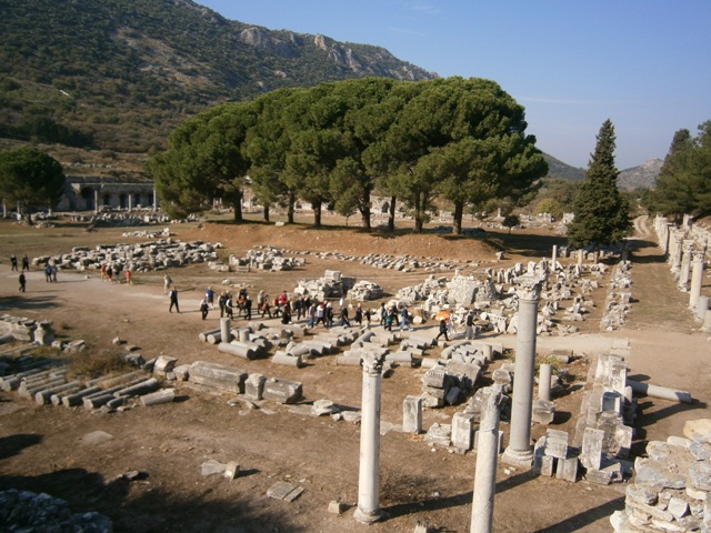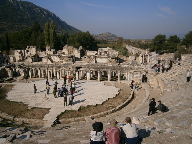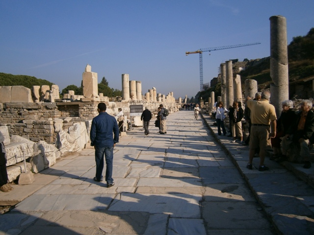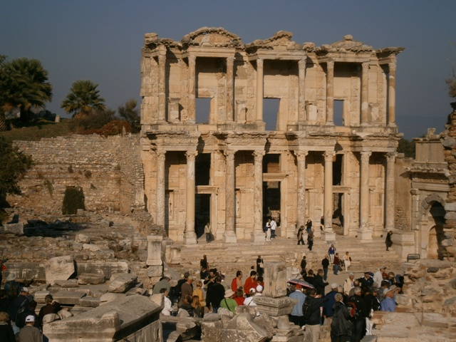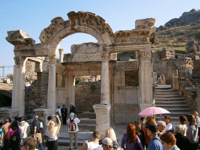 Frühmorgens fahren wir los nach Ephesus. Im Hafen von Kusadasi sehen wir ein wohngebäudegrosses Kreuzfahrtschiff liegen, dessen Passagiere sicher ebenfalls die Ausgrabungen sehen wollen. Wir durchqueren den Ort Selcuk zum Ausgrabungsgelände 3 und betreten durch das Osttor die historische Stätte. Unser frühes Aufstehen nützte uns nichts, es sind schon sehr viele Busse da und es wimmelt vor Besuchern. Ertan hat uns schon auf dem Weg dorthin erklärt, dass Ephesus von den Amazonen gegründet wurde und nach ihrer Anführerin benannt wurde. Die Stadt soll 250.000 Einwohner gefasst haben, es ist unglaublich, was sich schon damals vor fast 2000 Jahren hier abgespielt haben muss. Höhepunkt der Freiluftausstellung ist die in den 1970ern von einer österreichischen Baufirma restaurierte legendäre Celsus-Bibliothek.