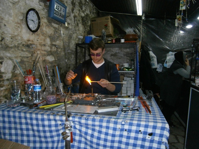 Glasaugenmacher bei der Arbeit Unser Reiseleiter erzählte uns, dass die hellhäutigeren, teilweise blonden Einwohner direkte Nachkommen der Griechen-Türken sind. Bei einem kleinen Einkauf sprach ich einen derartigen jungen Mann darauf an und er bestätigte mir, dass seine Großeltern aus Saloniki sind. Leider wäre der Großvater gerade nicht da, aber er wies mir den Weg zu einer älteren Frau, als ich danach fragte, ob es denn noch jemanden gäbe, der Griechisch spricht. Ich fand sie in einer Gruppe mit anderen Frauen, die dort Kräuter und Feigen verkauften. Als ich sie auf Griechisch ansprach, brauchte es eine kleine Weile, bis sie verstand, dass eine Touristin sie auf Griechisch ansprach. Im Folgenden unterhielten wir uns ein wenig und sie erzählte mir, dass sie vor 40 Jahren auf Vermittlung ihrer Eltern dorthin geheiratet hätte und original aus Chania, Kreta stammt. Sie sprach auch noch mit kretischem Akzent. Ihre türkischen Freundinnen starrten sie verwundert an. Jedenfalls hatte ich den Eindruck, dass sie sich freute, mit jemandem Griechisch sprechen zu können.  |
