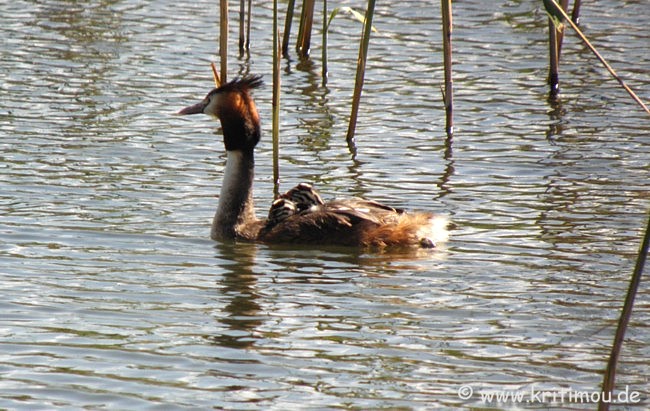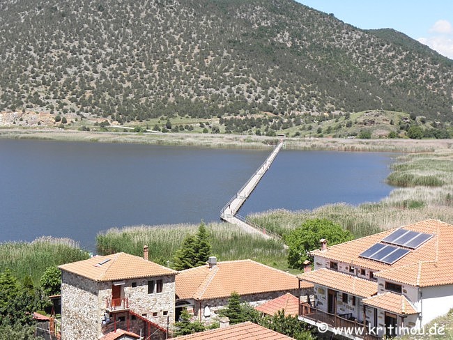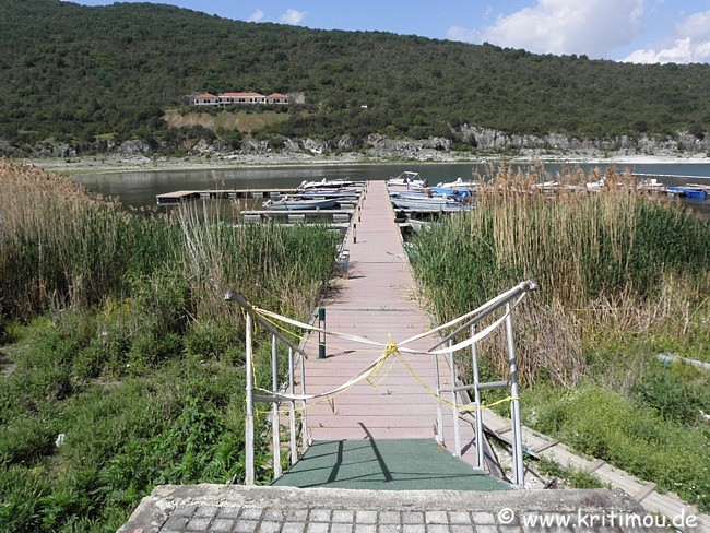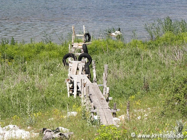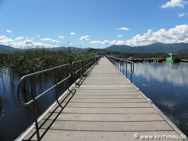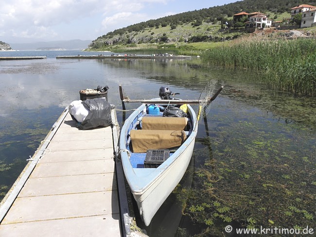 Wir haben uns schon fast daran gewöhnt, dass wir an Land keine Vögel zu sehen bekommen. Aber ein wenig traurig bin ich darüber schon. Da unsere Bootsfahrt heute ja nicht stattfinden kann, beschließen wir, über einen Steg durch den Kleinen Prespasee zur Insel Agios Achílios zu spazieren und dort ein wenig herumzuschlendern. Vielleicht bekommen wir dort ja Pelikane vor die Kameralinse. Allerdings müssen wir das Auto zum Steg bewegen, das man an seinem diesseitigen Ende abstellen kann. Zu Fuß wäre es uns ein wenig zu weit. So wie vor 11 Jahren bieten auch hier Bohnenverkäufer ihre Waren von ihrem Fahrzeug aus feil. Weil wir schon damals von der Qualität der getrockneten Bohnen begeistert waren, schlagen wir auch dieses Mal ordentlich zu. Von jeder Sorte wandern ein paar Tüten in unseren Besitz. Ich freue mich schon auf unsere Gigantes aus dem Backofen und den Augenbohnensalat mit roten Zwiebeln und Balsamico-Essig. Vielleicht esse ich heute Abend Bohnen, falls diese im Angebot sind. Nachdem wir die Ware im Kofferraum verstaut haben, betreten wir den metallenen Steg, hinüber zur Insel. ![]() So tief ist der Kleine Prespasee gar nicht, nur bis zu 8 Meter. Und dies wahrscheinlich eher in der Mitte des Sees. Der Steg jedoch ist in Ufernähe verankert, direkt neben einem Schilfgürtel. Haubentaucher sind in diesem fischreichen Gewässer im Paradies. ![]() Größere Vögel sehen wir leider keine. Die Pelikane werden sicherlich eher auf dem Großen Prespasee sein. Vielleicht gibt es da für sie bessere Fische und vor allem noch weniger Menschen. Oder sie sind blickgeschützt im Schilf versteckt, das hier üppig sprießt. ![]() Die Insel Agios Achílios ist bei Touristen sehr beliebt. Einige begegnen uns unterwegs auf dem Steg, haben ihre Besichtigung schon hinter sich. Ganz schön heiß ist es um die Mittagszeit geworden, fast schon sommerlich. Bei unserer Ankunft auf der Insel fällt mir direkt auf, dass einige der damaligen Ruinen instand gesetzt wurden. Nichts wirkt jedoch künstlich. Das kleine Dorf ist ursprünglich geblieben, so wirkt es jedenfalls. Idyllisches Landleben, von Hektik keine Spur.