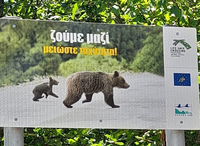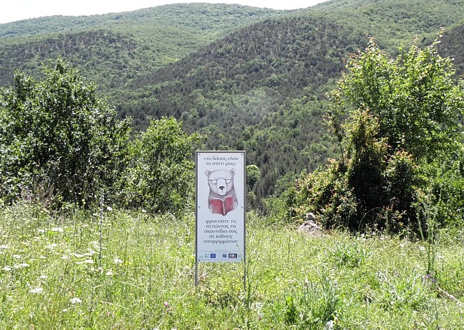 Bei unserer Anfahrt über die Autobahn von Vrasná aus geben wir am Anfang ordentlich Zunder, um dann später die Bergwelt langsamer durchfahren zu können. In Florina legen wir ein letztes Päuschen ein und füllen vorsichtshalber den Tank nochmals bis zur Unterkante, bevor wir zur letzten Etappe nach Prespa ansetzen. Uns erwartet eine kurvenreiche Strecke über eine schmale Landstraße, die sich immer länger dahinzieht, mitten durch eine von Wölfen und Bären bewohnte Wildnis. ![]() Wir leben zusammen - Geschwindigkeit runter! ![]() Der Wald ist unser Zuhause - pflegen Sie ihn, indem Sie Ihren Müll in die Mülltonnen werfen. Für die knapp 60 Kilometer, die nun nur noch von vereinzelten Winzweilern unterbrochen wird, benötigten wir bei langsamer Fahrt über anderthalb Stunden, sodass die Schatten bei unserer Ankunft schon länger geworden sind. Was wir uns auf keinen Fall entgehen lassen wollen, ist nach der Fahrt entlang des kleinen Prespasees und der Durchquerung des Landsteges zwischen den beiden Seen ein Aussichtspunkt auf der letzten kleinen Anhöhe, bevor es nach Psarádes hinuntergeht. Der Ausblick von hier oben weitet das Herz. Nichts hat sich verändert seit unserem letzten Besuch, keine neuen Siedlungen, Hotelkomplexe oder sonstige Anlagen sind hinzugekommen. Stattdessen nur der See, in dem sich Wolken und Landschaft spiegeln. Bei jeder Vorbeifahrt werden wir hier anhalten, ein wenig innehalten und die Aussicht genießen.