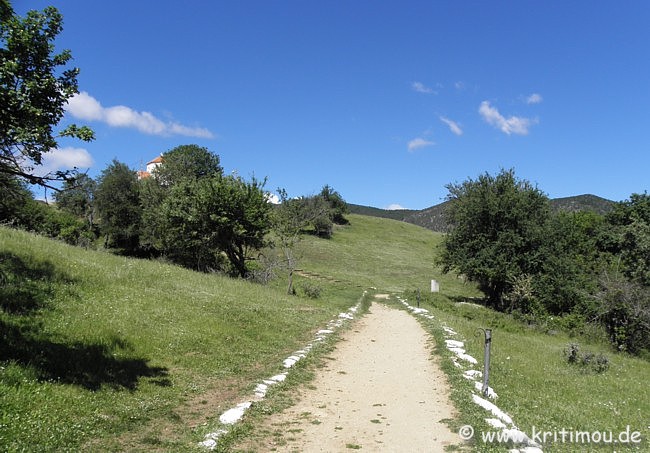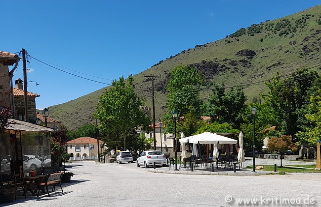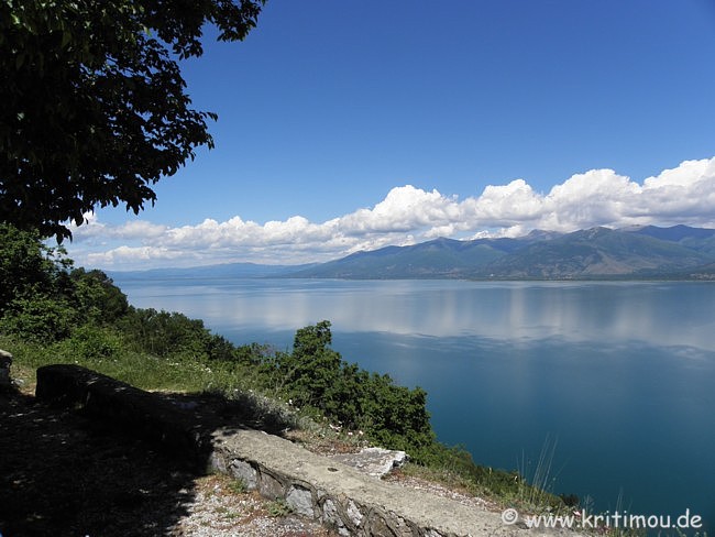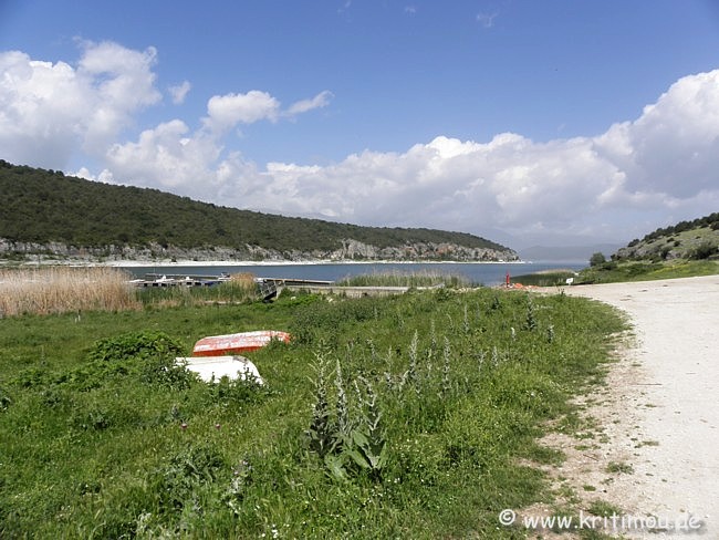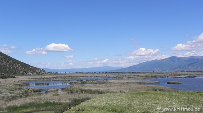 ![]() Blick in einen Teil des Feuchtgebiets: vor uns die sumpfigen Ausläufer des Kleinen Prespasees, dahinter ein ganz schmales blaues Band des Großen Prespasees; am Fuß des Hügels links ist eine Straße erkennbar, die zum Aussichtspunkt führt, an dem wir auf der Hinfahrt Halt gemacht haben. ![]() Auf der Insel gäbe es noch mehr zu besichtigen, doch irgendwie fehlt uns die Lust dazu. Wir waren ja schon einmal hier. Und so schlendern wir einfach immer nur weiter, über eine Wiese, und freuen uns auf ein Kaltgetränk in der Dorftaverne. Dort angekommen hat die lärmende Gruppe von der Basilikaruine schon Platz genommen. Allerdings im Innenbereich, sodass wir uns für die rustikalen Holzbänke im kleinen Hof, vor dem Gebäude, entscheiden. Es gibt selbst gemachte, unglaublich erfrischende Zitronenlimonade. Am Nachbartisch sitzt ein deutsches Paar, Neurentner wie wir, grundsätzlich mit Camper und hier mit Rädern unterwegs. Es ergibt sich ein sehr netter Austausch über das, was wir hier erfahren haben, über das Reisen insgesamt und die Freude, endlich Zeit für all das zu haben, was wir über die Jahrzehnte der Berufstätigkeit eben nicht erleben konnten. Nach der sehr sättigenden zweiten Limonade machen wir uns dann langsam auch wieder auf den Weg zurück. Ein Radfahrer brettert hinter uns her und überholt. Das macht sicherlich Spaß auf dem schmalen Steg, dessen Teile alle paar Meter durch kleine „Metallbrücken“ miteinander verbunden sind. Viel zu schnell ist das Ufer wieder erreicht und wir sitzen im Auto, fragen uns, was wir jetzt unternehmen könnten. Zum nahe gelegenen Aussichtspunkt fahren und dort ein wenig die Aussicht genießen, fällt uns ein. Dort, wo wir bei der Hinfahrt schon vorbeigekommen sind. Der See erscheint je nach Tageszeit und Bewölkung immer wieder anders. Am schönsten finde ich ihn, wenn sich Wolken wie in einem impressionistischen Gemälde darin spiegeln. ![]() Der weitaus größte Teil des Kleinen Sees gehört zu Griechenland und nur ein Zipfel zu Albanien. Beim Großen Prespasee ist es anders. Zu Griechenland gehören nur der Fjord bei Psarádes, ein Stück links davon sowie der ein bis zwei Kilometer davor liegenden Teil bis zum rechten Ufer. Auch der albanische Teil ist nicht größer. Zu Nordmazedonien gehört der weitaus größte Bereich des Sees, mehr als der griechische und der albanische zusammengenommen. Doch das spielt keine Rolle, außer dass man eben nicht von Psarádes aus hinüber darf. Das würde sich natürlich schlagartig ändern, wenn diese beiden Länder auch in die EU aufgenommen würden. Dann könnte der See touristisch ganz anders erschlossen werden. Ob das den Pelikanen gut bekäme, wenn ihr Lebensraum sich durch die wahrscheinlich dann in vermehrter Zahl fahrenden Ausflugsboote noch mehr einschränken würde? Heute jedenfalls haben wir keinen einzigen Pelikan gesehen. Ihre Brutinseln liegen zwar sehr versteckt in der Schilflandschaft, doch kein einziger Vogel war in der Luft oder auf dem Wasser zu erkennen. Was ist nur passiert? Da ich kein Wissen über das Verhalten der Vögel habe, kann ich mir das nicht erklären. Vielleicht kommen ja später doch noch welche zum Ufer in Psarádes. Agios Germanós Da wir schon mal mit dem Auto unterwegs sind, bietet sich ein Besuch in Agios Germanós an, das etwa 7 km vom See entfernt liegt, also nicht direkt am Ufer, sondern an einer Steigung auf über 1.000 Meter Höhe. Der Ort ist auch größer als Psarádes und hat eine breiter gefächerte Infrastruktur. Mal schauen, was wir hier noch besichtigen können. An einer ansprechenden Platía vorbei fahren wir noch ein kleines Stück, bevor wir das Auto am Straßenrand abstellen. Wir beschließen, dem Dorfverlauf bergan zu folgen, an einem Wasserlauf vorbei, der durch das Dorf fließt. In diesem Flüsschen soll die geschützte Prespa-Forelle leben. Schön grün ist es hier. Aber nirgendwo ist eine Menschenseele an diesem Nachmittag unterwegs. Wo sind die Leute nur alle?