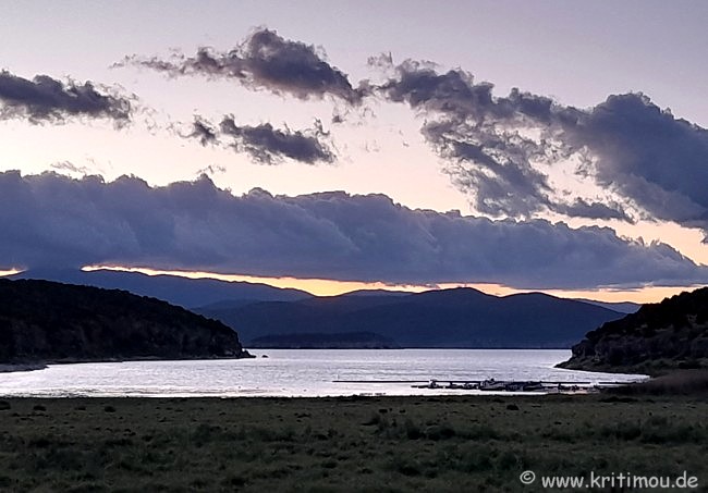 ![]() Unser Zimmer entpuppt sich als klitzeklein. So winzig hatte ich es mir nicht vorgestellt, insbesondere weil es überhaupt keine Ablagemöglichkeiten hat und man sich an den wenigen vorhandenen Möbelstücken vorbeiquetschen muss, um von A nach B zu gelangen. Am nächsten Tag, so schlägt man uns vor, können wir in ein größeres Zimmer ziehen, was wir gerne annehmen. Für das Abendessen hatte ich mich schon sehr auf einen frischen Fisch gefreut, doch den gibt es leider nicht. „Keine Fangsaison“, lautet die Begründung. Das ist sehr schade, doch es kann ja niemand etwas dafür. Verhungern werden wir jedenfalls nicht, denn anderes Grillgut ist ja reichlich vorhanden. Bei unserem ersten kleinen Abendspaziergang hinunter zu den Stegen betrachten wir einige der eleganten, langgezogenen Fischerboote mit den kleinen Außenbordmotoren, die hier vertäut sind. Auf einem solchen wollen wir an einem der Tage zum Höhepunkt unseres Aufenthaltes wieder hinaus auf den See, um den Pelikanen noch etwas näher zu sein und die Stimmung auf dem See erneut einzufangen, um sie im Herzen mit nach Hause zu nehmen. ![]() Heute Abend ist von den Krausköpfen hier in Ufernähe jedoch nichts zu sehen. Auch sonst keine Vögel. Wahrscheinlich haben sie sich schon in ihre Nachtquartiere zurückgezogen. Stattdessen begleiten uns zwei struppige Hunde, die überall herumschnüffeln und jeden Besucher herzhaft anbellen, um nur kurze Zeit später mit demütigen Blicken etwas vom Teller des Tavernenbesuchers zu erbetteln. ![]() Eine Kuhherde wurde im Laufe des Spätnachmittags hier zum Seeufer getrieben und weidet am Rande des sumpfigen Ausläufers des Fjords. Eine kecke Braunfellige schaut sich die Leute in der Taverne genau an, bevor sie um einen geparkten PKW herumstreift. Ganz schön neugierig, die Dame! Langsam senkt sich die Sonne über dem See und taucht die Landschaft in ein liebliches Licht. Nur von kurzer Dauer ist das Schauspiel, dann umgibt Dunkelheit unsere Taverne. ![]() Nachtaktive Moskitos gibt es zu dieser Jahreszeit keine, was im Gegensatz zu den Sommermonaten wirklich erfreulich ist. Auch so kalt, wie ich es befürchtet hatte, ist es nicht. Und so kann man sich recht lange draußen aufhalten, mindestens, bis die Tavernenfamilie die Lichter löscht, wenn alle Arbeit erledigt ist. Psarádes Dorfrundgang