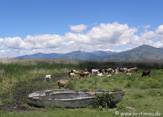 ![]() Unseren Blick hat der örtliche Friedhof mit seiner Kapelle eingefangen, der weiter oberhalb des Dorfes angelegt wurde. Von hier hat man einen extraschönen Blick über Dorf und See, Fjord und Landschaft ringsherum, wie ich finde. Daher verweilen wir ein wenig vor dem Eingang dieses stillen Ortes und stellen uns vor, wo genau sich die Honoratioren im Juni 2018 versammelt hatten, um das sogenannte Prespa-Abkommen über die Namensänderung des ehemaligen FYROM zu unterzeichnen, das sich mit Zustimmung des griechischen Parlaments fortan Nordmazedanonien nennen durfte. Psarádes bot sich aufgrund seiner Lage im Dreiländereck geradezu dafür an. Wie aus dem Nichts versperrt uns bei unserem Abstieg hinunter zum Seeufer die braune Kuh vom gestrigen Abend die Straße und beäugt uns eingehend. Sie ist ganz gut an dem einen Horn zu erkennen, das ihr leider abgebrochen ist. Doch sie scheint sich daran nicht zu stören, mit anderthalb Hörnern lebt es sich offensichtlich auch ganz gut. ![]() Später wird sie von einem Ladenbesitzer am Platz erwischt, als sie sich mal genauer bei den Geschenkartikeln umschaut. Ihren Verweis nimmt sie gelassen und rückt ein paar Meter zur Seite. Vielleicht ergibt sich später nochmal eine Gelegenheit einer genaueren Untersuchung der angebotenen Waren. Unser neues Zimmer steht bei unserer Rückkehr für unseren Umzug bereit. Dort hatte bis heute Morgen ein älteres griechisch-australisches Paar gewohnt. Der männliche Part stammt aus Psarádes, hatte er uns erzählt. Eigentlich hätte er schon noch gerne ein wenig bleiben wollen, doch da gab es wohl Protest. Schade für ihn, aber gut für uns, denn so können wir uns schließlich etwas besser ausdehnen, besorgen noch ein paar Gegenstände für unsere Bequemlichkeit und sind zufrieden. Nach dem Umzug fällt uns absolut nichts mehr ein, was wir heute noch unternehmen könnten. Also ziehen wir wieder in die Taverne und lassen den Tag dort ausklingen. Sehr aufgefallen ist mir, dass wir den ganzen Tag über gar keine Pelikane gesehen haben. Ich frage einen etwas wortkargen Mann, der vielleicht auch der Tavernenwirt ist und heute Morgen hingebungsvoll einen großen Eimer Kartoffeln geschält hat, nach den Vögeln. Sie seien auf dem See, lautet die einsilbige Antwort. Nun ja, eine Bewandtnis wird das schon haben. Aber irgendwie schade, denn ich hatte mich so sehr auf den Anblick der Vögel auch hier in Ufernähe gefreut. Wenn sie auf dem See sind und nicht zu uns kommen, dann werden wir bald zu ihnen fahren. Ein guter Anlass, jetzt nach einer Bootstour zu fragen. Als ich meine Wünsche vortrage, schaut er mich zunächst etwas verhalten an. Ich möchte nämlich nicht mit einem der schnellen Sportboote auf den See, sondern – wie 2013 – mit einem Fischerboot, wenn es möglich ist. Das sei nicht mehr erlaubt, meint er, doch er wird mal schauen, was er ermöglichen kann. Er müsse einen Freund kontaktieren und würde uns Bescheid geben. Das wird schon noch, denke ich mir. Wie soll man sonst die Stille auf dem See und alles andere, was seine Besonderheit ausmacht, einfangen, wenn man schnell darüber hinwegfährt? Wahrscheinlich wird auch bei eine solchen Tour mal der Motor ausgestellt, doch der Sitz in einem der länglichen Fischerboote, direkt über der Wasseroberfläche, eröffnet während der Fahrt eine ganz andere Perspektive. Man fühlt sich auf Augenhöhe mit der umgebenden Natur und wird langsam dahinziehend ein Teil davon. Einige Zeit später erhalten wir die Auskunft, dass eine Fahrt in einem solchen Boot wohl möglich sei, doch der genaue Tag sei wetterabhängig. Bei Wind würde er mit uns keinesfalls hinausfahren, das sei zu gefährlich. Morgen ginge es nicht, meint er, da sei nämlich schon viel Wind vorausgesagt (was sich schließlich auch bewahrheitet), aber man könnte mal den übernächsten Tag ins Auge fassen. Ich mache mir keine Sorgen, denn wir haben ja noch etwas Zeit hier eingeplant, um eine Ausfahrt hinzubekommen. Und rudern würde er uns übrigens auch nicht, nur mit Motor!! Ja stimmt, davon war ich auch ausgegangen, hatte ich nur nicht erwähnt. Wir sind ja schließlich nicht in Venedig! Daraufhin werden wir noch mit Druckerzeugnissen über den See und die historischen Sehenswürdigkeiten versorgt. Während der Ausfahrt auf den See gibt es im Fjord nämlich auch verschiedene verlassene Einsiedeleien und mittelalterliche Felsmalereien zu besichtigen. Falls es sich ergibt, können wir ja an Land gehen und uns ein wenig umschauen, und wenn nicht, ist es auch gut. Wir werden sehen. Insel Agios Achílios