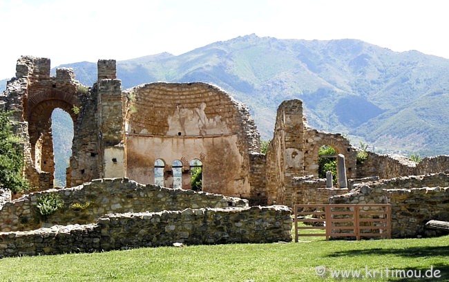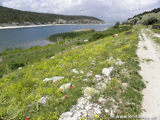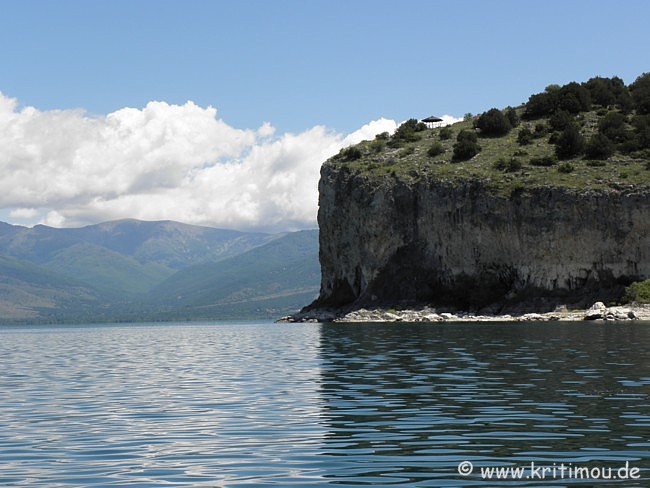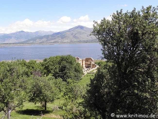 ![]() Man fragt sich dann schon, wie man so weit vom Schuss wirklich leben kann, insbesondere in der unwirtlichen Jahreszeit. Ob es dann überhaupt Einwohner hier gibt? Von Psarádes aus ist es schon eine ziemliche Gurkerei über die Berge nach Flórina, um sich mit den Dingen des täglichen Bedarfs einzudecken. Doch von der Insel aus erscheint es noch umständlicher. Doch wer hier wohnt, hat sicherlich ein paar gute Tricks auf Lager, um sich das Leben angenehm zu machen. Wir gehen jedoch noch nicht ins Dorf, sondern folgen dem schmalen Weg geradeaus. ![]() Nach wenigen Minuten schon kommt die Ruine einer mittelalterlichen Basilika (11. Jahrhundert) am Seeufer in unser Blickfeld. Schon imposant das Gemäuer. Es wurde seit unserem letzten Besuch noch weiter hergerichtet und ist wahrscheinlich der Hauptanziehungspunkt für Touristen. So auch für eine griechische Frauengruppe, deren Mitglieder sich laut herumschreiend verständigen. Zu hören sind sie nicht nur vor und innerhalb des Gemäuers, sondern auch schon von weiter her. Nicht dass sich noch jemand verläuft!