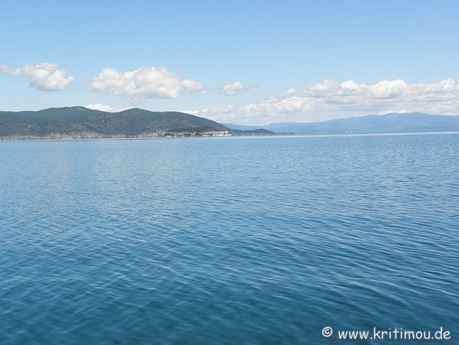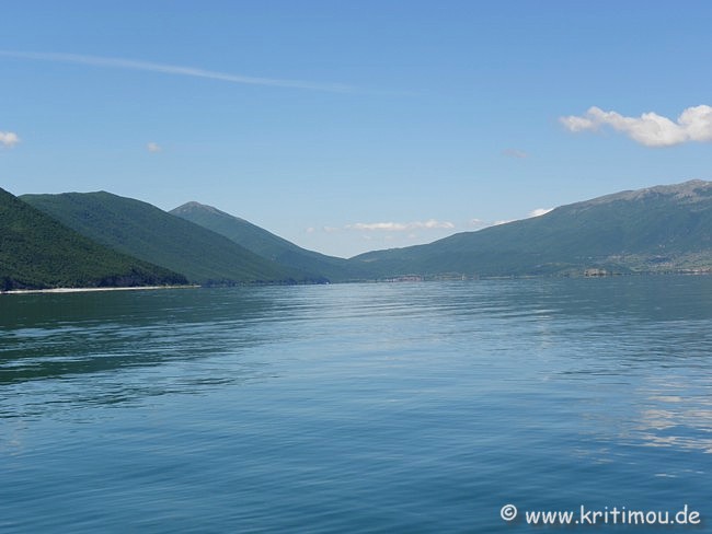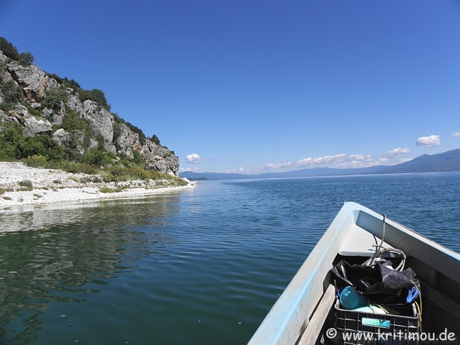 ![]() Immer noch unausgelastet nach dem kleinen Spaziergang und mit einem zu frühen Abendessen, versuchen wir, schon zeitig etwas zu schlafen. Tatsächlich war außer uns nur eine einzige andere Paréa in der Taverne. Ein bulgarisches Nummernschild klebt an ihrem Auto. Leider ist ihre Gruppe recht geschlossen, sonst hätte man sich ein wenig austauschen können. Doch die Signale sind eindeutig. Später in der Nacht beschließen wir, im Mondschein einen Spaziergang durch die Dorfstraßen zu unternehmen. Uns erwarten bereits die beiden Hunde, die unbedingt mitwollen. Sie veranstalten einen Höllenlärm, als wir vorsichtig vom Zimmer hinunter zur Straße schleichen, um niemanden aufzuwecken. Sie wirken topfit und sehr neugierig, springen über Zäune, schnüffeln überall herum, bellen hin und wieder, laufen uns zwischen den Beinen herum und sind offensichtlich guter Dinge, als ob sie sich über diese spontane Abwechslung freuen würden. Wir folgen der Dorfstraße so weit die Straßenbeleuchtung reicht. Dann kehren wir wieder um. Nicht dass da noch irgendwo ein Bär auf uns wartet. Aber bei dem Getöse der Hunde hätte der sich bestimmt längst davon gemacht. Bootsausflug auf den Großen Prespasee Schon recht früh sitzen wir wieder in der Taverne beim Frühstück, während unser Bootskapitän in spe an einem der anderen Tische seine Kartoffeln pellt. Er bestätigt unseren Ausflug, und tatsächlich regt sich kein Lüftchen. Wahrscheinlich wird es noch ein wenig wärmer, als es gestern schon war. Perfekt für unsere Unternehmung. Die Zeit bis dahin vertrödeln wir mit einem ausgedehnten Mahl und viel Kaffee. ![]() Blick von der Frühstücksterrasse Eine andere Paréa hat sich heute dazugesellt. Es sind zwei Polizisten, und wir bilden uns ein, dass sie nicht zufällig hier sitzen. Vielleicht schauen sie, ob mit unserem Ausflug in dem kleinen Boot alles klar geht. Vielleicht sind sie auch nur so da. Endlich geht es los. Wir nehmen Platz in dem schaukelnden Bötchen. Eine Decke liegt über einem Brett, der Bootsführer sitzt ganz hinten am Steuer. Und schon gleiten wir langsam hinaus. Neben uns ist noch eine weitere Gruppe losgefahren, allerdings in einem der größeren Motorboote schneller unterwegs. In diesem Augenblick bin ich sehr dankbar, dass unser Kapitän es ermöglicht hat, unseren Ausflug nach unserem Gusto zu gestalten. Später erfahren wir noch, dass die andere Ausflugsgesellschaft ganz schön neidisch auf uns war, als sie uns in dem kleinen Boot dahintuckern sah. Es wäre schön, wenn man diese Möglichkeit allen eröffnen könnte, denn das Erlebnis ist so doch ungleich intensiver. Langsam gleiten wir am linken Fjordufer dahin, nähern uns einigen Sehenswürdigkeiten. Es sind Heiligendarstellungen, die vor einigen Jahrhunderten, als das Wasser des Sees noch um einige Meter höher stand, dort auf den Stein gemalt wurden. Ganz nah passieren wir sie. Kaum vorstellbar, wie heilige Männer hier fernab jeglicher Zivilisation ihr Überleben bewerkstelligten und sich dabei auch noch gestalterisch verewigten.