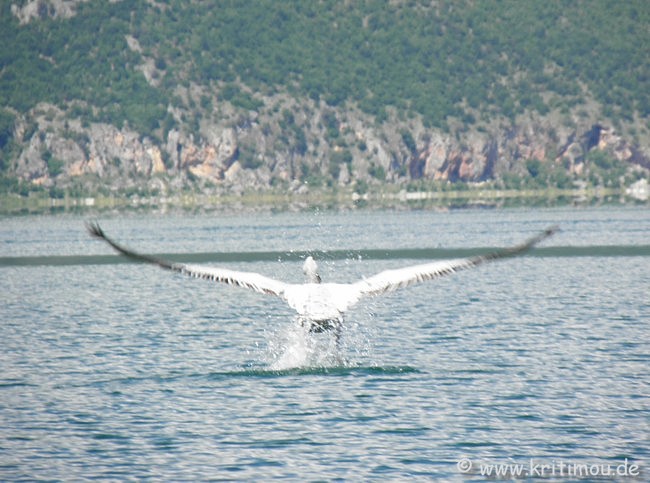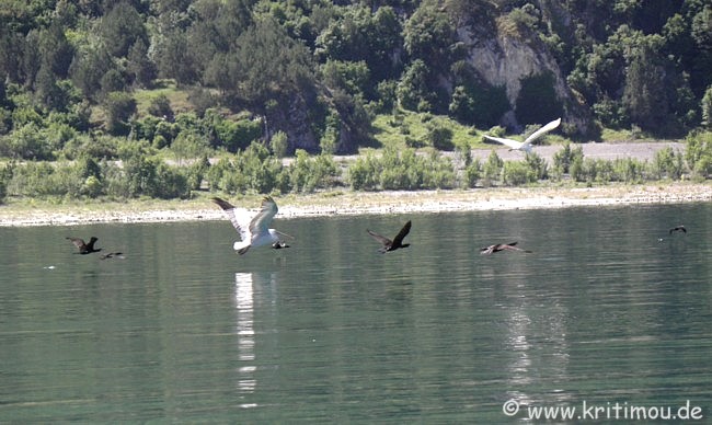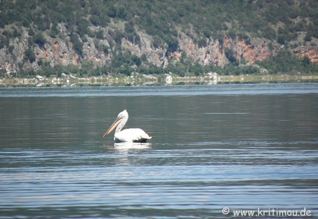 ![]() Auch verlassene Klöster und Einsiedeleien könnten besichtigt werden. Die Wänder im Innern sollen von etlichen gut erhaltenen Ikonen geschmückt sein. Doch unser Guide rät davon ab, an Land zu gehen. Zu dieser Jahreszeit böte sich das nicht an. Ich hätte heute eher auch weniger Lust zu einer derartigen Besichtigung. Mich interessiert, wo die Vögel sind. ![]() Am Ende des Fjords thront über der Landspitze das Kap Rotí mit seinem hölzernen Aussichtspunkt. Schon bei unserem ersten Bootsausflug vor elf Jahren waren wir darauf hingewiesen worden, dass hier manchmal Bären aus den Bergen herkämen. Auch heute wird mir das nochmals bestätigt. Ich habe in der Kürze unseres Aufenthaltes keine Zeit, mich darauf einstellen zu können. So wagemutig bin ich dann doch nicht, den im Internet beworbenen Spaziergang zum Kap zu wagen. Mit den großen Wildtieren zu leben und zu wissen, wie man sich in der Wildnis verhält, dazu bräuchten wir für ein gutes Gefühl wohl eine entsprechende Begleitung oder zumindest eine Verhaltensanleitung. ![]() Nach der Umrundung des Kaps gelangen wir auf offenes Wasser hinaus. Dennoch bleiben wir zunächst in der Nähe des Steilufers, an dessen Verfärbungen man gut erkennen kann, dass der Pegel des Sees vor einigen Jahrzehnten noch etliche Meter höher stand. Nicht nur die hohe Wasserentnahme für die Landwirtschaft bedingte die Abnahme des Wasserstandes, sondern auch die Dürre der vergangenen Jahre, mit weniger Schnee im Winter und Schmelzwasser im Frühjahr, führten zu Schwankungen in der unmittelbaren Vergangenheit. So erzählt es uns der Bootsführer. ![]() Als ich meine Hand kurz ins Wasser tauche, bin ich überrascht, wie warm es ist. Wohl noch gedanklich mit dem Schnee in den Bergen beschäftigt, hatte ich es eiskalt erwartet. Die recht warme Temperatur sei normal für diese Jahreszeit, erfahren wir. Fast an derselben Stelle wie bei unserer ersten Fahrt erblicken wir einen Fuchs, der uns aus seiner Deckung heraus längst erspäht hat. ![]() Wo sind nun die Pelikane? Auf dem See, hatte man uns doch am ersten Tag erzählt. Aber hier sehe ich zunächst gar keine Vögel. Im Winter, vor zwei Jahren, seien viele von ihnen an einem Virus gestorben, lüftet unser Bootsführer kurz und knapp endlich das Geheimnis, ohne weitere Erläuterungen. Bis dahin stellte diese Brutkolonie am Prespasee eine weltweite Hoffnung auf die Erhaltung der Art schlechthin dar. Kleinere Kolonien gibt es auch an anderen Stellen in der Welt, die abgelegen genug sind und den anspruchsvollen Vögeln entsprechende Voraussetzungen bieten, die sie zur Brut benötigen. Diese findet man insbesondere in menschenarmen Gegenden Südosteuropas, einige davon auch in anderen Feuchtgebieten Griechenlands. Die Kolonie am Prespasee jedoch ist die mit Abstand größte weltweit! Sie ist in den letzten Jahrzehnten, in denen sie streng geschützt wurde, stetig gewachsen, auf einige hundert Einzeltiere und 1.400 Brutpaare. In den 1960er Jahren waren es noch nicht einmal einhundert. Einen sehr großen Verdienst beim Schutz der seltenen Vögel hat die SPP (Society for the Protection of Prespa), die nach eigenem Bekunden genau zu diesem Zweck gegründet worden war, deren Tätigkeitsfeld sich jedoch erweitert hat. Es bedurfte zeitintensiver Mühen der Aufklärung und eine wachsende Einsicht der Bewohner der Seeufer, dass Mensch und Tier nebeneinander existieren können, ohne dass einer dem anderen etwas wegnimmt. Ganz im Gegenteil: Der Besuch der Pelikane durch Touristen bescherte dem einen oder anderen Bewohner der umliegenden Dörfer ein Zubrot zu anderen Einnahmen, wie denen aus der Fischerei. Diese Jahrzehnte währenden Anstrengungen des intensiven Artenschutzes sollten nun einen solchen Dämpfer erfahren haben? Weggewischt in wenigen Monaten? Mein Verstand weigert sich, das zu glauben. ![]() Blick zum nordmazedonischen Ufer und der Schlangeninsel Golemgrad Jetzt beschreiben wir eine große Kurve und erkennen auch die Bojen, die mitten durch den See gelegt wurden, um die Grenzen zu den Nachbarstaaten anzuzeigen. Wunderschön ist es hier auf dem Wasser. Jede Wendung mit dem Boot lässt den See und die Umgebung in einem anderen Licht erscheinen: mal dunkler, mal heller bis hin zum blendenden Gegenlicht. Doch wo damals viele der großen Vögel dahinsegelten, herrscht heute gähnende Leere. ![]() Blick zum albanischen Ufer, auch hier keine Pelikane in Sicht Unser Kapitän, der uns an Land etwas schroff erschien, begegnet uns auf dem Wasser ganz anders. Auskunftsfreudig erklärt er uns jedes Detail, nach dem wir fragen, und ermuntert uns ihm mitzuteilen, wann er für Fotos anhalten soll. Allein die langsame Fahrt über die Wasseroberfläche ist mir schon ein großer Genuss. Man versteht, wie Menschen, die in der Natur, insbesondere auf Seen und Meeren arbeiten, nicht mehr davon loskommen, wie sehr die umgebende Natur allein auf dem Wasser die Seele beeinflusst. Schließlich gelangen wir zu dem kleinen Landvorsprung, der auch damals schon eine Lieblingsstelle für verschiedene Wasservögel wie Reiher und Kormorane, aber auch für Pelikane zu sein schien. Endlich bekommen wir einige dieser so wunderschönen großen Vögel zu Gesicht.
