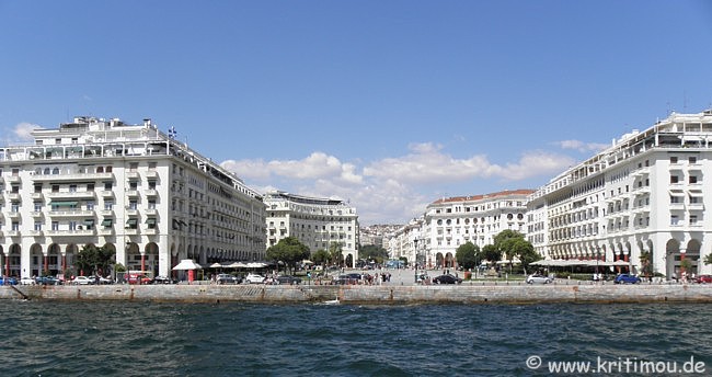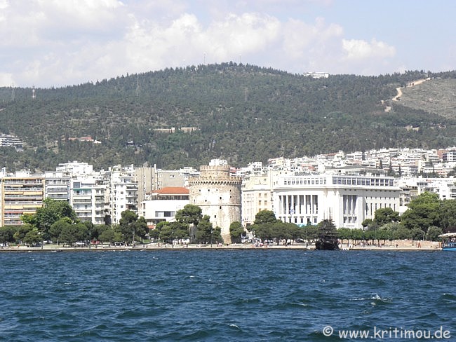 ![]() Es ist noch früh am Nachmittag, als wir wieder mit dem Bus zum Weißen Turm zurückgekehrt sind. Da heute unser letzter Tag in der Stadt ist, möchten wir unseren Aufenthalt einfach austrudeln lassen, und entschließen uns noch zu einer kleinen Hafenrundfahrt mit einem der ankernden Ausflugsschiffe. Wir können auch direkt an Bord und steigen hinauf aufs Oberdeck. Das wellige Wasser bringt das Boot ganz schön zum Schaukeln. Eintritt haben wir keinen entrichten müssen, doch zahlt man nach dem Ablegen mit der Bestellung eines Getränkes, z.B. einer kleinen Flasche Wasser für 8 EUR. Das ist preislich sehr moderat. Die Poseidon fährt im Hafenbecken parallel zur Uferlinie hin und her und gewährt uns einen Perspektivenwechsel auf den Weißen Turm, den Aristoteles-Platz und den Hafen selbst. Auch die Promenade kann man einmal zur Gänze vor sich sehen.