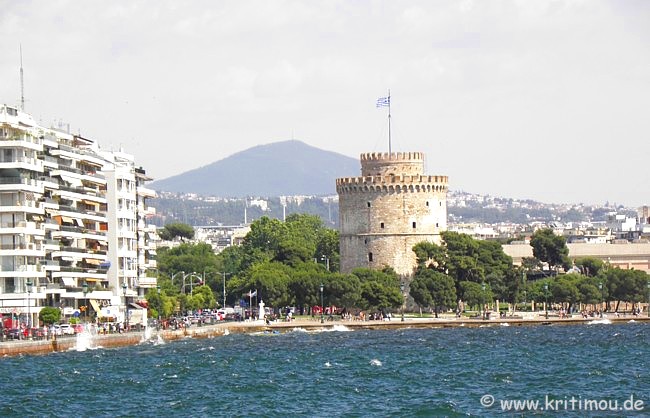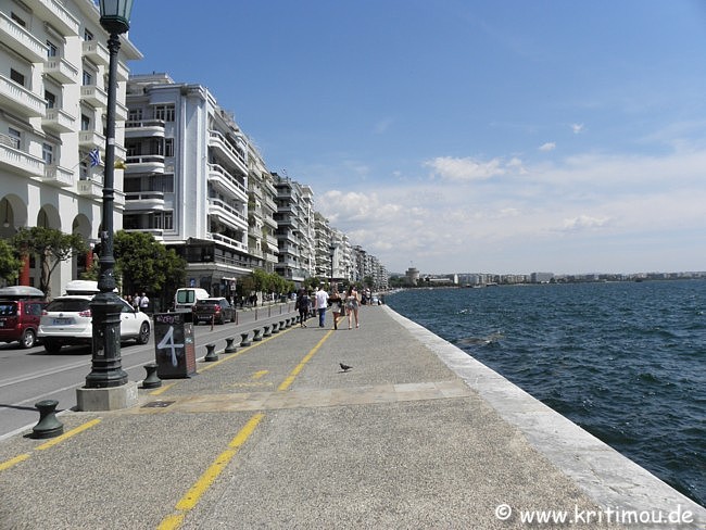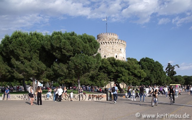 ![]() Das Wasser im Hafen ist aufgewühlt und man muss ein wenig Acht geben, denn immer wieder klatschen Wellen über die Promenade. Etliche Frachter, die auf Einlass in den Hafen warten, liegen vor Anker. Voll besetzte Ausflugsboote transportieren Menschen hin und her, die das Leben und den beginnenden Sommer feiern. Moderne Musik tönt aus den unzähligen, gut besuchten Cafés auf der anderen Straßenseite der Promenade. ![]() Unser Ziel ist zunächst der ab dem 15. Jahrhundert zu osmanischer Besatzungszeit vom damals berühmten Architekten Sinan! errichtete Weiße Turm (Léfkos Pýrgos). Massen von Nachmittagsausflüglern hatten dieselbe Idee. ![]() Der Turm hatte im Laufe der Jahre verschiedene Funktionen, als Garnison, Gefängnis oder, wie heute, als Museum. Als eines der Wahrzeichen der Stadt wird man im Laufe seines Besuches in Thessaloníki mindestens einmal hier vorbeikommen. Doch nicht immer verläuft der Aufenthalt wie geplant. So ist es schon vorgekommen, dass einem Burschen (hier Giórgos Zambétas) in einer romantischen Stimmung der Kopf derart verdreht wurde, dass er innerhalb von zwei Monaten heiratete und Thessaloniker wurde. Auslöser dafür waren wohl die Küsse, die er Am Weißen Turm (Sto Levkó ton Pírgo) erhalten hat. Also besser dort aufpassen! Von unserem Sitzplätzchen auf einer Mauer genießen wir den Schatten des Turmes. Seine Besichtigung scheitert später an den Öffnungszeiten (bis 15.30 Uhr). Man hätte in jeder der sieben Etagen eine Ausstellung anschauen können. Stattdessen gehen wir noch ein Stück weiter. Hier beginnt eine noch breitere Fußgängerfläche, in deren Mitte ein farblich abgesetzter Streifen für Roller und Räder verläuft. In unmittelbarer Nähe findet eine Info-Veranstaltung von Pink Together (Frauen mit Brustkrebs), mit kurzen Redebeiträgen, Musik und thematischen Tänzen statt. Mindestens zehn große Zelte stehen nebeneinander aufgereiht. Auf Unterschriftenlisten können die zahlreichen Besucher/innen und Aktivist/innen ihre Unterstützung ausdrucken. Noch etwas weiter, am Brunnen schauen wir uns auf dem Begrenzungsmäuerchen sitzend wieder die vorbeiziehenden Menschenströme an. Was für eine Lebensfreude! Etliche Tavernen in der Nähe des Weißen Turms haben auf unserem Rückweg schon geöffnet, sodass wir uns entschließen, hier zu bleiben. Nach einem ausgedehnten Mahl trotten wir schließlich zurück über die Promenade, die nun schon längst nicht mehr so voll ist, überqueren den nunmehr leeren Aristoteles-Platz und fallen nach der halb durchwachten gestrigen Nacht in einem wunderbaren Hotelbett in einen seligen Schlummer. Platía Aristotélous und Ladádika Der andere Morgen beginnt mit einem außerordentlichen Frühstück im siebten Stockwerk des Hotelgebäudes, oben auf der Dachterrasse. Man kann sogar draußen sitzen, und genau hier ergattern wir noch einen Tisch. Was für ein Blick über die Platía und das Hafenbecken! So kann der Tag beginnen.