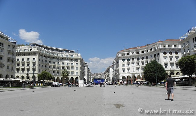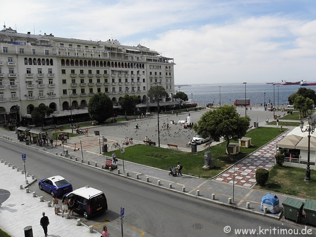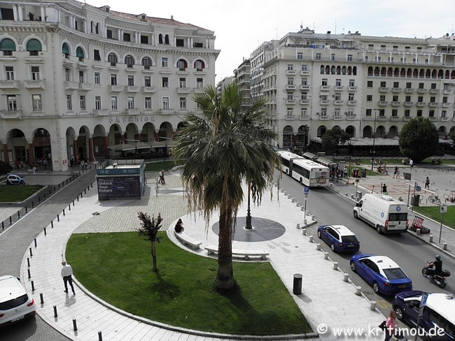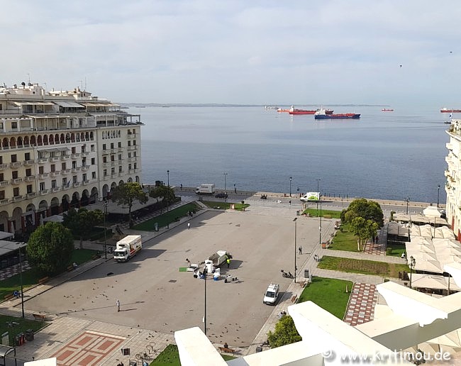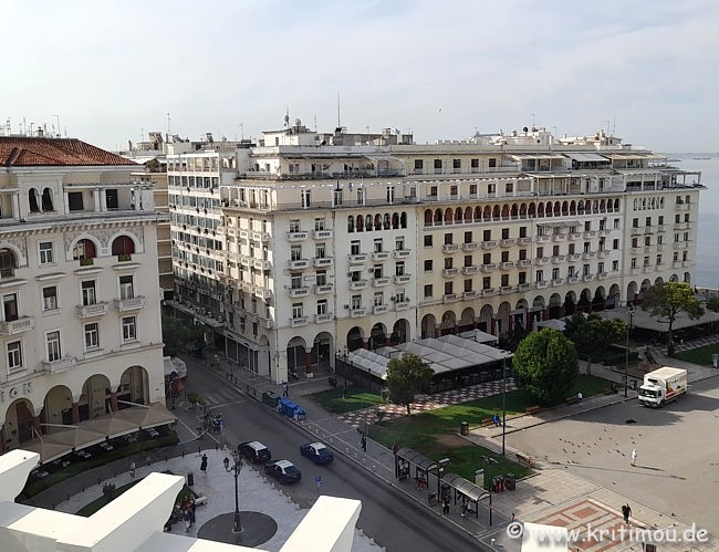 Bis tief in die Nacht wurde in einem Café unterhalb unserer Wohnung in Kastoriá lautstark gefeiert, sodass für uns trotz gut schließender Fenster kaum an Schlaf zu denken war. Und so brechen wir ziemlich müde zur letzten Etappe unserer Reise auf. Wieder fahren wir durch eine unglaublich schöne, menschenleere Berglandschaft, über tiefe Schluchten und Brücken und durch zahlreiche Tunnel. An der Strecke gibt es kaum Ortschaften, sodass es scheint, als wäre die Autobahn einfach mitten in die Wildnis hinein gezimmert worden. Leider finden wir nirgendwo eine Stelle zum Anhalten, um den einen oder anderen Ausblick zu genießen. An mehreren Stellen scheint es längere Passagen frequentierter Bärenübergänge zu geben, sodass in einiger Entfernung rechts und links der Straße durchgehende Zäune angebracht wurden, die die Tiere zu ihrem eigenen Schutz zum Ausweichen zwingen. Schließlich erreichen wir die Abfahrt hinunter in eine Ebene auf Meereshöhe, mit 600 Metern Höhenunterschied. Ankunft in Thessaloníki Im Gegensatz zu den Tagen vorher erwarten uns in Thessaloníki sommerlich heiße Temperaturen (annähernd 30 Grad). Wir freuen uns schon auf einen Spaziergang durch die Wärme. Da es direkt am Hotel kaum Halte- geschweige denn Parkmöglichkeiten gibt, möchten wir zuerst den Mietwagen am Flughafen abgeben, bevor wir mit dem Gepäck per Taxi zum Hotel fahren. Die Automiete bei Alamo hat wie stets sehr gut geklappt. Bei der Auswahl unseres Hotels hatten wir uns im Vorfeld wieder einmal nicht entscheiden können. Die wie Pilze aus dem Boden geschossenen Ferienunterkünfte mögen wir nicht so sonderlich. Hotels mit schlechteren Bewertungen kamen auch nicht in Frage. Und so hatten wir ausnahmsweise ein Zimmer im noblen Electra Palace Hotel auf dem Aristoteles-Platz gebucht.