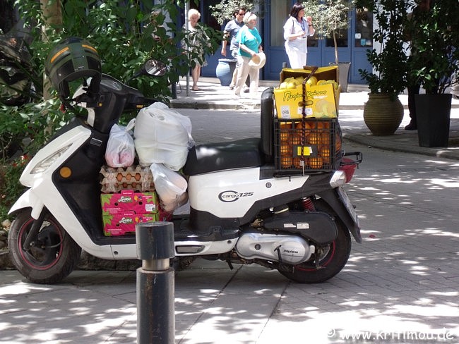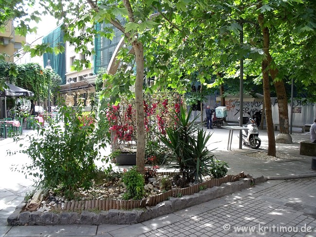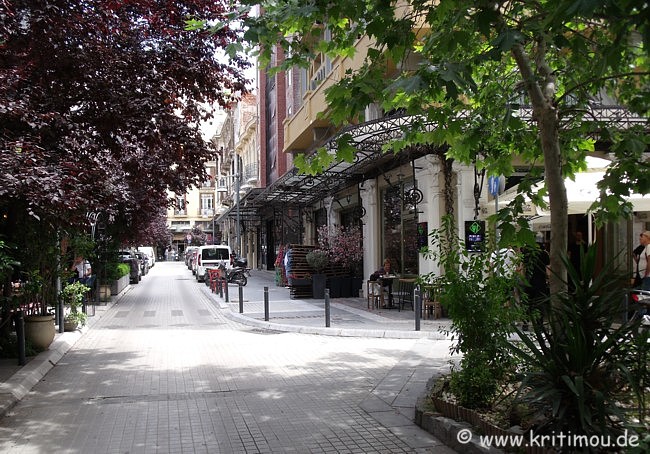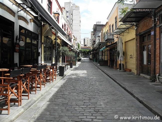 ![]() Uns präsentiert sich ein sehr reichhaltiges Buffet mit wirklich allem und für jede Geschmacksrichtung, was man sich zum Frühstücken nur wünschen kann. Eine große Kanne Kaffee wird am Tisch serviert. Jeden kulinarischen Wunsch liest man uns von den Augen ab. Wir wären verrückt, wenn wir den Aufenthalt hier oben nicht ausgedehnt genießen würden, insbesondere, weil wir später auch im Viertel bleiben wollen. Der Aristoteles-Platz gehört zum innersten Herzen Thessaloníkis. So alt ist er in seiner heutigen Form noch nicht, denn er wurde erst im Jahr 1917, nach dem Großbrand, der das Zentrum der Stadt zerstört hatte, vom französischen Architekten Ernest Hébrard entworfen. Außergewöhnlich sind seine Anlage mit der Öffnung zum Thermaischen Golf hin, die zwei halbkreisförmigen Gebäude, die den Platz zur Stadt hin begrenzen, wovon eines das Hotel Electra Palace beheimatet, sowie die Arkadengänge mit den zahlreichen Cafés und Geschäften. Er wurde nach dem Denker Aristoteles benannt, ebenso wie die Straße, die von hier im rechten Winkel nach Nordosten verläuft, oder auch die Universität der Stadt. Quasi um die Ecke des Hotels liegen die Ladádika, ein historischer Stadtteil, früher tagsüber Markt- und abends Rotlichtviertel, das der unsterbliche Dimítris Mitropános einst besungen hat. Uns fallen als erstes aber keine Geschäfte oder Märkte auf, sondern die unzähligen Cafés, Bars und Restaurants, die sich nahtlos aneinander reihen. Aus dem alten Handelsbezirk ist offensichtlich ein Ausgehviertel geworden. ![]() Wenn man genau hinsieht, erkennt man jedoch noch ein ganz klein wenig vom alten Flair. Mopeds und Motorroller knattern voll beladen vorbei, auch Handwerker holpern mit ihren Autos geschäftig durch die schmalen Sträßchen. ![]() In einigen Cafés hängen ein paar Leute tiefenentspannt herum, genießen ihren Kaffee und die Unterhaltung. Touristen sind (noch) Mangelware.
