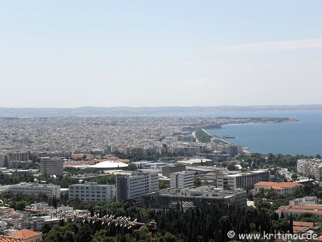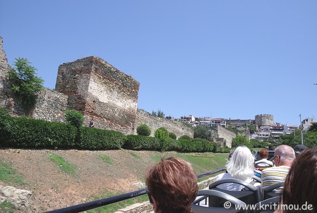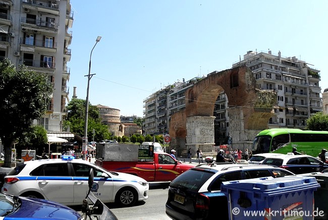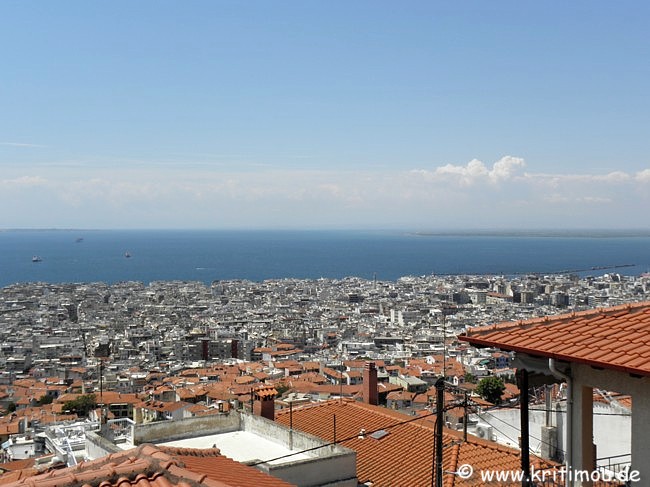 ![]() In einem kleinen Eckcafé kehren auch wir ein und lassen uns einen anregenden Kaffee schmecken. Inbesondere das köstliche, mit Zimt und Zucker bestäubte und mit Vanillepudding gefüllte Gebäck versüßt uns den Aufenthalt. Und weil es so lecker ist, schieben wir noch ein zweites hinterher. Später werden wir nach längerer Suche nach einem dringend benötigten Gewürzladen doch noch fündig. Das alt eingesessene Geschäft hat wirklich alles, was wir uns nur so wünschen können. Während ich in den Regalen zwischen den verschiedenen Tüten herumsuche, haben sich der ältere Besitzer und Alex in ein Gespräch vertieft. Die Frauen der Familie, die die Bedienung der Kunden übernommen haben, müssen ihn zwischendurch immer wieder an seine Pflichten erinnern, nämlich die Kunden abzukassieren. Für 20 EUR erhalten wir am Ende große Tüten (extra für uns abgefüllt) mit Oregano und Thymian, und kleinere mit Brühe, Muskat, süßem Paprika, Lorbeer, sogar Chia-Samen und verschiedenen Tee-Sorten – insgesamt 2 kg Gewürze. Die müssen uns jetzt wieder für eine Weile in Deutschland reichen bzw. sind auch als Mitbringsel gedacht. Später bummeln wir wieder über die Hafenpromenade, die heute wesentlich leerer ist als gestern. Bei etwas windigem, aber warmem Wetter kehren wir bald schon wieder in ein Café ein, genießen das entspannte Lebensgefühl und lassen die Seele baumeln. Da die Ladádika so nah beim Hotel sind, werden wir am Abend dorthin zum Essen gehen und finden ein Restaurant mit kretischen Speisen, das Athiwolí. Nicht nur verwöhnen die kulinarischen Köstlichkeiten unsere Gaumen, sondern auch die Freundlichkeit, mit der wir hier bedient werden, trägt erheblich zu unserem Wohlbefinden bei. Und so verbringen wir hier ein paar sehr schöne Stunden, bevor es zurück zum Hotel geht. Stadt- und Hafenrundfahrt Für heute steht eine Tour mit einem Hop-On-Hop-Off-Bus auf dem Programm. Schon öfter haben wir uns die Sehenswürdigkeiten der Stadt näher angeschaut und in unserem Reisebericht Nordgriechenland 2009 (letzte drei Teile) beschrieben. Mit dem Bus werden wir heute einfach vom Weißen Turm abfahren, am Galerius-Bogen und der Rotunde vorbei und zum höchsten Punkt der Stadt, dem Burgviertel als unser einziges Ausstiegsziel.