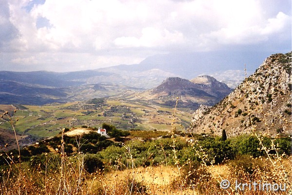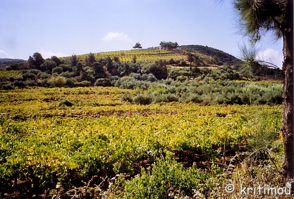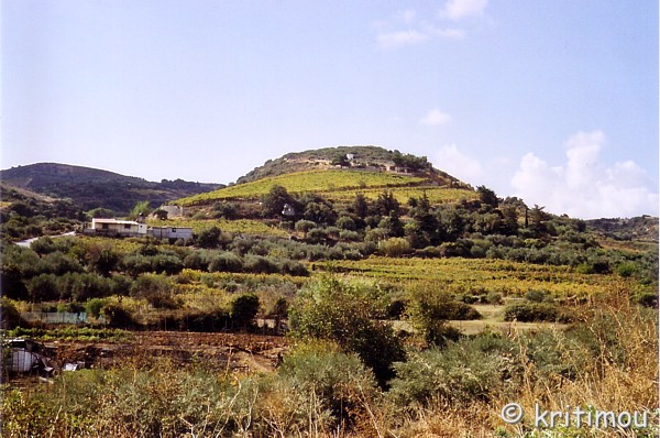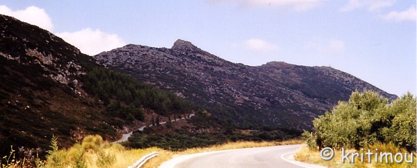 Sicherlich gibt es schönere Fußwege von Archánes aus nach Houdétsi als ausgerechnet über die Hauptstraße. Doch in Ermangelung besserer Ortskenntnisse wagten wir keine Querfeldein-Märsche. Außerdem sah es nicht so aus, als ob das Wetter über den Tag hin beständig bliebe. Aufziehende Wolken sorgten zwar für angenehme Temperaturen, Regen schien jedoch auch im Bereich des Möglichen. ![]() ![]() Wieder faszinierte uns die herbstliche Weinlandschaft hinter dem (südlichen) Ortsausgang von Archánes. Der Geschmack der fruchtigen Reben, denen wir am Vorabend ausgiebig gefrönt hatten, saß noch in unseren Gaumen. Bald passierten wir den nun wohl bekannten Abzweig zum Joúchtas. Von der Straße aus ist die kleine Bergkette sehr deutlich zu sehen, und endlich konnten wir auch das Profil des "schlafenden Zeus" erkennen: ![]() Rechts sieht man die Stirn; über die Vertiefung der Nasenwurzel steigt man bergan zur Nasenspitze
