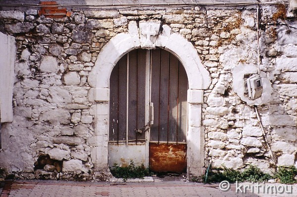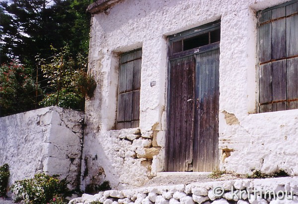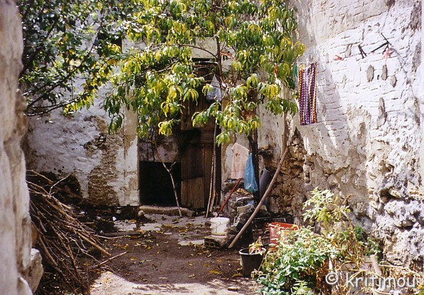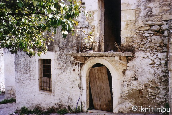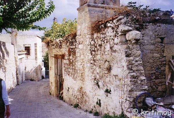In der Außenanlage der Kapelle laden Bänke zum Verweilen ein. Ein Farbenspiel von Sonne und Wolken spiegelte sich in den Kiefern und Laubbäumen des Kirchgartens wieder. Sehr lauschig war es hier und mittlerweile ganz schön schattig, weil zu den Wolken auch noch ein kühler Wind aufkam. Deshalb setzten wir schon bald unseren Weg fort. Die Straße verbreiterte sich und beschrieb eine lang gezogene Kurve, der wir auf jeden Fall folgen mussten. Der Weg erschien uns weiter, als er auf der Karte ausgesehen hatte. Zum Glück war die Piste kaum befahren, so dass wir uns nicht mit nervenaufreibendem Straßenverkehr auseinander setzen mussten. Im Gegenteil, es war angenehm ruhig. Ein älterer Kreter kam uns entgegen, der einzige Fußgänger, dem wir bisher begegnet waren. Offensichtlich freute auch er sich über einen kurzen Schnack. Die üblichen Floskeln nach dem Woher und Wohin wurden ausgetauscht. Er war per Anhalter unterwegs und Germanía kannte er nur aus seinen Träumen. Nach Houdétsi sei es nicht mehr weit, meinte er, noch etwa einen Kilometer. Nach weiteren paar hundert Metern saß da mutterseelenallein ein Verkäufer in einem Verschlag am Straßenrand, der Früchte, Knoblauch und ein paar Gläser Honig im Angebot hatte. Auch hier ein kurzer Austausch, dann überließen wir ihn wieder seiner Radioübertragung. Endlich, oben auf dem Scheitelpunkt der Kurve, konnten wir die ersten Häuser von Houdétsi erkennen. Es war ein wenig enttäuschend. Nicht dass wir große Erwartungen gehegt hätten, denn wir waren eigentlich eher wegen der Wanderung an sich unterwegs. Doch die Häuser da vermittelten den Eindruck eines gottverlassenen Weilers an einem Highway. Beim Näherkommen erkannten wir jedoch, dass das eigentliche Dorf sich an einen Hügel bergab schmiegt, den man von der Hauptstraße aus nicht sehen kann. Was in Archánes PKWs und frisierte Mopeds sind, sind in Houdétsi dröhnende LKWs, beladen mit Baumaterial, und anderes schweres Gerät aus ortsansässigen Firmen. Doch die Lautstärke und Dichte wie in Archánes erreicht der Verkehr hier bei weitem nicht. Der Ort wirkte auf uns klein, mit neueren Häusern, nichts besonderes. FALSCH! Bald zeigt ein Schild nach links zu einem „Traditional House“, dem wir in eine schmale Gasse hinein folgten. Hier betraten wir plötzlich und unvermittelt das alte Kreta mit den schmalen, verwinkelten Gassen eines Ruinendorfes, das fast zur Gänze so geblieben ist, wie es war, unrenoviert und jetzt am Verfallen. ![]() ![]() ![]() ![]()