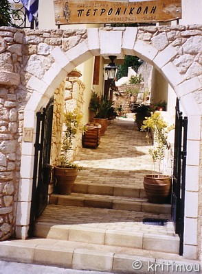 ![]() Blicke durch offene Türen auf zum Teil eingefallene Mauern zeigen, wie die Kreter früher gelebt haben: Dicht an dicht, in verwinkelten Zimmern, die miteinander verbunden waren, in denen sie selbst mit ihren Familien und dem Vieh lebten. Alles eng und gedrungen, gut geschützt gegen extreme Wetterlagen und Feinde. Ein Mann mit einem langen Brett auf der Schulter trat mir in den Weg, ein Blick, ein Gruß, ein Lachen, wir waren im Gespräch. Er bat uns herein in eine gut erhaltene Ruine, die jetzt doch renoviert wird, wollte uns die alten Hinterlassenschaften zeigen. Der Boden war noch wie früher ohne Betonplatte. Ein Kamin in einem fensterlosen Raum hat damals für ausreichend Wärme im Winter gesorgt, groß genug für ein ordentliches Holzfeuer. In einer dunklen Ecke eine Getreidemühle. Ein gemauertes Viereck mit steinernem Ausguss, in dem früher die Trauben getreten wurden. Der Raum für das Vieh, in dem sich der Geruch gehalten hat. Ein Kellner aus einem der Restaurants in Archánes bog plötzlich um die Ecke - beiderseitiges Erkennen. Auch er half hier mit. Mittlerweile hatte auch ein Opa die Szene betreten. Neugierig fragte er, woher wir kamen und wohin wir unterwegs wären, um uns anschließend mitzuteilen, dass jeder der beiden Jungs hier ein „kaló paidí“ (gutes Kind) sei. Man zeigte uns, in welche Richtung die nächste Taverne lag, denn mittlerweile hatten wir riesigen Hunger. Wir knipsten uns durch das Ruinendorf in Richtung Platía, unserem Ziel. Es freut mich immer wieder, auf diese alten Relikte zu stoßen. Diese Häuser erzählen Geschichten, stacheln die Phantasie an, verströmen den Zauber vergangener Tage, vergangener Zeiten. Erinnerungsfetzen an die mir bekannteren Dörfer der Messará, wie Pitsídia und Kamilári, vor fünfzehn Jahren und an die Atmosphäre zwischen den Bruchsteinmauern. Am Rand der Ruinensiedlung von Houdétsi sind Häuser renoviert worden. Vielleicht möchte niemand mehr in dieser Enge wohnen. Heute baut man größer und üppiger, mit genügend Platz zum Nachbarn, wenn das Grundstück die entsprechende Größe besitzt. ![]() Mittlerweile hatte sich ein ordentliches Hungergefühl in unseren Mägen breit gemacht. Das erste Lokal, das wir sichteten, war ein geöffnetes Mesedopoleío, frei übersetzt ein „Vorspeisengeschäft“. Gerade zur rechten Zeit betraten wir das Lokal, denn es hatte zu regnen begonnen. Ein paar Griechen erwiderten unseren Gruß, die deutsche Touristen-Familie, die gerade ihr Essen in sich hineinschaufelte, bekam die Zähne dazu nicht auseinander. Nachdem wir uns innen einmal umgeschaut und die Wirtsleute begrüßt hatten, richteten wir uns auf der überdachten Terrasse ein. Das Lokal trägt auf dem Schild den Untertitel "Die zwei Agápi“, Oma und Enkelin heißen so. Doch ich glaube, dass María, die Tochter und Mutter in der Generation dazwischen das heimliche Regiment führt. Wir ließen uns beraten. María hatte am Morgen frische Linsensuppe gekocht. Die kam jetzt gerade richtig. Sie servierte einen Bauernsalat, der seines gleichen sucht. So was von frischen, guten Tomaten. Dazu eine riesige Portion würziger und cremiger Ziegenkäse. Ein wahrer Genuss! Dazu gab es Omelett mit Kartoffeln und Käse. Richtig pappsatt waren wir danach. Wein hatten wir zum Essen getrunken. Doch nun stellte María die Rakikaraffe auf den Tisch und gesellte sich zu uns. Den Raki möge sie gerne, verriet sie uns. Jammas! María ist eine lustige und warmherzige Frau und ihr Mann ein lustiger und netter Mensch, der uns mit einer Schale kleiner, süßer, kernloser Trauben verwöhnte. Ob wir wegen Ross Daly gekommen seien? Nein, eigentlich nicht. Ross Daly hätte ich eher in Archánes vermutet. Hier, in diesem abgelegenen Dorf, befindet sich jedoch das Instrumentenmuseum und die Musikwerkstatt, in der schon viele berühmte und weniger berühmte Musiker aus aller Welt geübt und gespielt haben. Und genau gegenüber davon saßen wir. Die Eingangstür war verschlossen, nur ein paar Hunde spielten im Garten. Er sei wahrscheinlich nicht da, wohl wieder irgendwo in der Welt unterwegs, meinte María. Ross Daly trafen wir am Ende unseres Urlaubs im Flughafen von Iráklion, wo er in aller Herrgottsfrüh mit wehendem weißen Haar durch die Abflughalle huschte und sich schließlich mit einigen jungen Damen unterhielt. Wahrgenommen von den Kretern, aber unbehelligt, so groß ist der Respekt, den man ihm zollt. Doch zurück nach Houdétsi. Marías Tochter, Agápi, gesellte sich schließlich zu uns, eine sehr nette junge Frau. Wir unterhielten uns über die Lebensumstände in unseren Ländern und über die Gemeinsamkeiten, die sich durch das Vereinte Europa eingestellt haben. Positives wie Negatives kam zur Sprache. Auch Persönliches. Sorgen wurden geteilt. Frauengespräche, in die sich Marías Mann nicht einmischte. Mit gekräuselten Lachfalten um die Augen und tiefer Verbeugung, mit der er an jedem Königshof sofort eine Stelle bekommen hätte, kredenzte er uns noch allerlei Köstlichkeiten zum Schnaps. Eine Quitte wurde geschält, dann ein Apfel. Selbst hergestellte Pittákia in Honig verwöhnten unsere Gaumen. Beim Rakí-Trinken ist es nicht verkehrt, wenn man immer ein wenig etwas zu beißen dazu hat. Rakí oder sonstiger Schnaps ist eigentlich nicht so meins, doch nach einer Weile war die Karaffe leer, den Alkohol merkte ich überhaupt nicht im Schädel. Echt leckeres Zeug. Später fragte María, wie wir eigentlich zurück kämen. Ich hatte an ein Taxi gedacht, doch María meinte, sie würde uns fahren. Am frühen Abend bretterten wir also zusammen mit der jungen Agápi über den Highway zurück nach Archánes. Die angebotene Bezahlung schlug María in den Wind, doch eine Einladung in eines der vielen Cafés nahm sie zu unserer Freude gerne an. Wir stiegen also die eiserne Wendeltreppe zu dem etwas zurück gesetzten Lokal, am unteren Rand der Platía, empor. In gepflegtem Ambiente mit dezenter, englischer Hintergrundmusik und hervorragendem Serv
