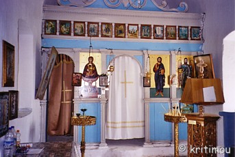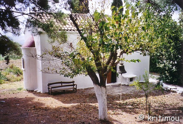 mit der Gipfelkirche, die wir besichtigt hatten. Links schließen sich Mund- und Kinnpartie an. Hinter dem südlichen Ende des Joúchtas breitet sich eine abwechslungsreiche, hügelige Landschaft aus. Zwei markante Kegel ragen – gleich nebeneinander – in die Höhe. Ein Adler kreiste dort, die anderen waren eher an der Westseite des Zeusberges zu finden, wo sie von Menschen relativ ungestört nisten und auf Nahrung hoffen können. ![]() Das archäologische Gelände der minoischen Villa von Vathýpetro liegt exponiert etwas abseits der Straße. Ein Weg führt dorthin, das Tor war leider verschlossen. Es war Montag, und dann ist hier, wie an vielen antiken Ausgrabungsstätten, Ruhetag. Viel konnten wir von außen nicht erkennen. Innen soll man eine Wein- und Olivenpresse aus jener Zeit besichtigen können. Langsam zogen immer dunklere Wolken auf. Einen Regenschutz hatten wir nicht dabei. Egal. Wir kehrten trotzdem nicht um, sondern gingen weiter zu unserem heutigen Ziel, dem Dorf Houdétsi, wo wir uns zumindest ein wenig umsehen und später auch einkehren wollten. Etwa ein bis zwei Kilometer weiter erreichten wir das Dörfchen „Vathýpetro“ mit der Taverne „To spíti tou petráki“ („Das Haus des Steinchens“) und zwei Kirchen. Die Taverne, in der wir gerne eine Kleinigkeit gegessen hätten, war leider geschlossen, die kleinere der beiden Kirchen jedoch geöffnet. ![]() Diese Kapelle mit ihrem blau gestrichenen Témplon (Altarwand) und den sehr gepflegten Ikonen ist ein kleines Schmuckstück.