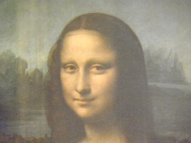 die Mona Lisa hinter Glas in einem eigens für sie eingerichteten Raum, wo man geduldig anstehen muss, um einen unverstellten Blick auf das Da-Vinci-Gemälde zu erhaschen.