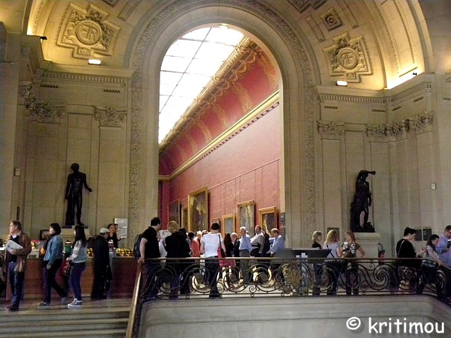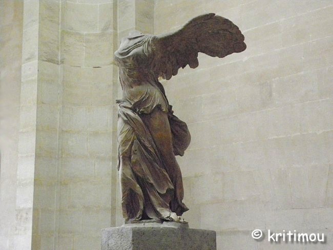 Obwohl wir am Vorabend richtig müde in die Federn gestiegen sind, haben wir die Nacht mit recht wenig Schlaf verbracht. Schuld daran war vielleicht der Vollmond, mit Sicherheit aber auch die Hellhörigkeit des Hauses und die musikalische Wochenend-Veranstaltung im kreolischen Restaurant gegenüber. Erst gegen Morgen ist es dann endlich ruhig geworden, sodass wir noch eine Mütze voll Schlaf ergattern konnten. Bis wir die Wohnung verlassen und schließlich den Louvre erreichen, ist es schon nach 13 Uhr. Es bleiben uns nur noch wenige Stunden für einen Besuch des Museums, denn um 18 Uhr wird es geschlossen. Die Realität holt uns ein, als wir die Menschenschlange sehen, die sich quer über den Cour Napoléon in Richtung Pyramiden-Eingang windet. Wieviele tausend Interessenten mögen es wohl sein? Nie und nimmer wird es uns gelingen, noch rechtzeitig für einen genussvollen Bummel durch das Museum Einlass zu erhalten. Das wäre nicht schlimm, wenn nicht morgen das Museum geschlossen wäre und wir tags drauf wieder die Heimreise antreten müssten. Was für eine Enttäuschung! Alex gibt sein Bestes, sucht fieberhaft nach einer Lösung. Vielleicht könnten wir mit einer Fahrradrikscha zum Fnac, die Champs-Élysées hoch in Richtung Arc de Triomph, wo wir schon einmal Tickets im Vorverkauf erstanden hatten und der Besucherschlange am Louvre ausweichen konnten? Ich winke ab, den gestrigen Verkehrsinfarkt auf dem Boulevard in Erinnerung, wird das alles viel zu lange dauern. Dieses Mal wird es also leider nichts mit dem Louvre, und dabei hatte ich mich gerade darauf am meisten gefreut. Nun gut, so haben wir einen weiteren Anlass, wieder hierher, nach Paris, zu kommen und uns dann richtig vorzubereiten. Was mich zumindest ein bißchen tröstet, ist die Tatsache, dass die wenige verbliebene Zeit bei weitem nicht ausgereicht hätte, all das aufzusuchen, was mir lieb gewesen wäre, selbst wenn wir sofortigen Zugang gehabt hätten. Vor drei Jahren waren wir schon am Vormittag da, mit einem vorgekauften Ticket, und verbrachten den ganzen restlichen Tag in den Räumen, knallten uns so voller sinnlicher Eindrücke, bis wirklich nichts mehr in Schädel, Seele und Geist passte, und die Füße am Ende beinahe ihren Dienst quittierten. Was uns damals neben der unbeschreiblichen Fülle der ausgestellten Kunstwerke imponierte, war die Art und Weise, wie sie in Szene gesetzt wurden; beispielsweise die Nike von Samothráki, die man auf einem Treppenabsatz positioniert hat, wo sie von drei Seiten aus verschiedenen Perspektiven betrachtet werden kann.