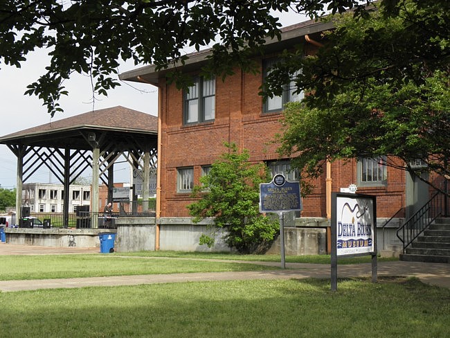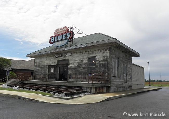 ![]() Das Paramount Theatre, als erstes Kino der Umgebung 1918 eröffnet, ist schon seit vielen Jahren geschlossen. Nur noch wenige Buchstaben lassen erahnen, was vormals über dem Eingang stand: Now Showing Real Blues (Jetzt wird der echte Blues gezeigt). ![]() Am Ende der Blues Alley, an der John Lee Hooker Lane, landen wir in der Nähe der Zuggleise am Delta Blues Museum, das um diese spätnachmittägliche Stunde geschlossen ist.