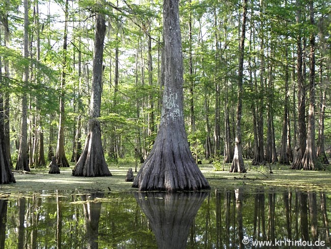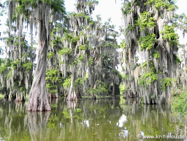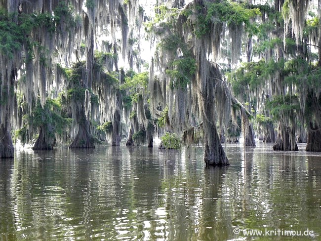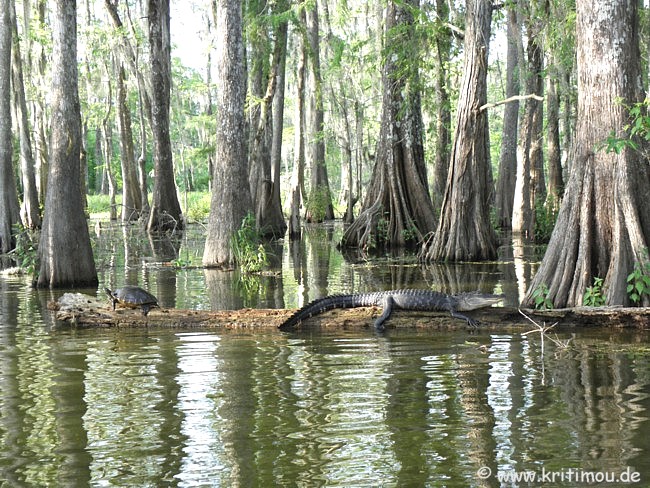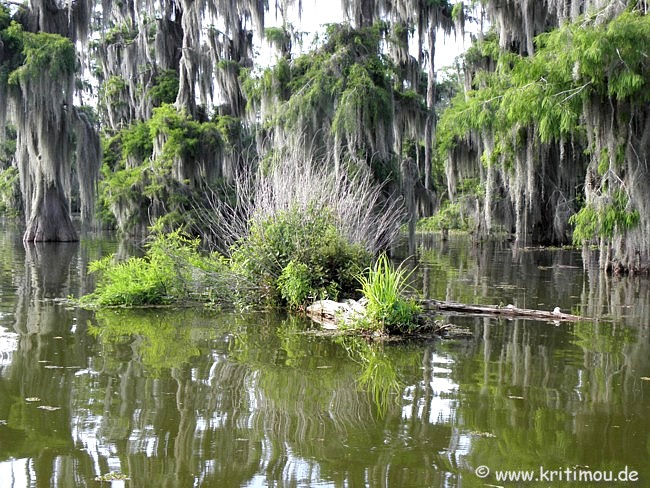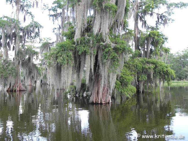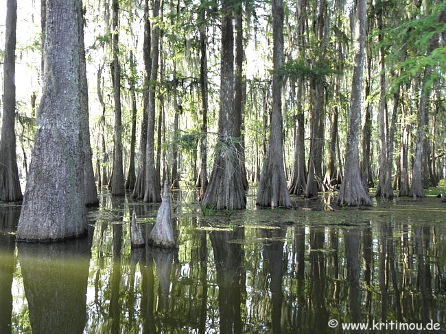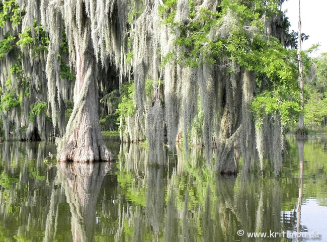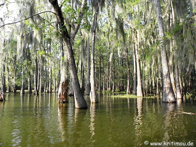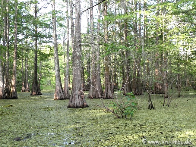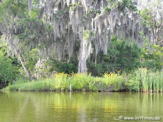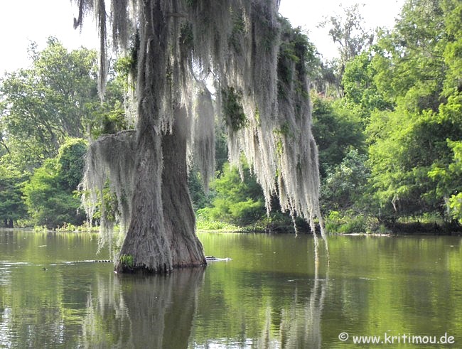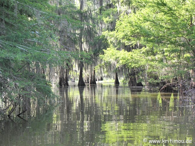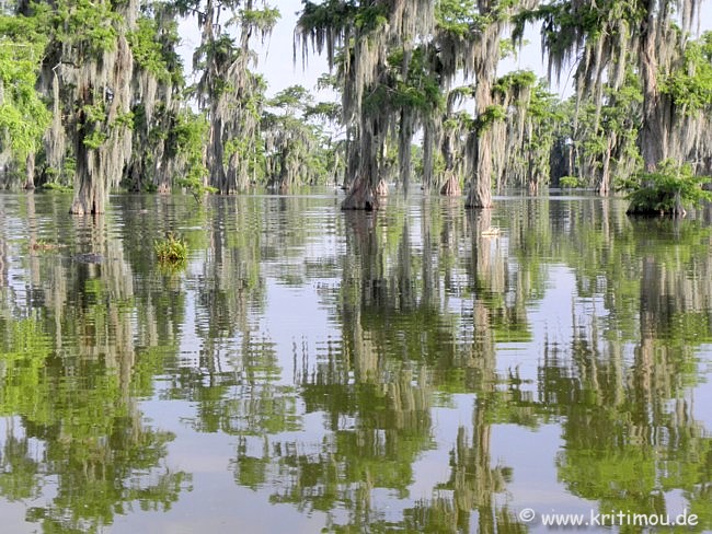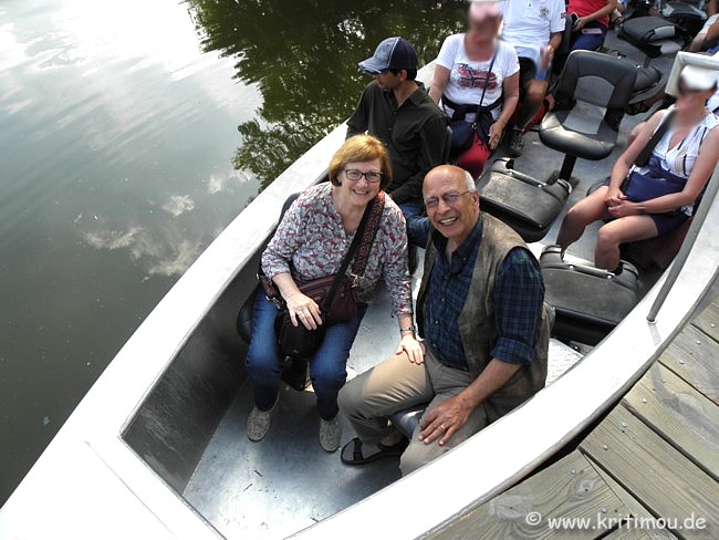 Unser Hotel haben wir daher in Henderson bei Breaux Bridge gewählt. Es befindet sich direkt neben der I-10, an einem Verkehrskreisel, nur 15 Auto-Minuten vom See entfernt. Schalldichte Fenster nach außen werden später für eine entsprechende Nachtruhe sorgen und eine Tankstelle mit kleinem Laden und mindestens ein Restaurant nebenan für eine ausreichende Infrastruktur. Wir hätten sicherlich idyllischer oder städtischer wohnen können, in Lafayette zum Beispiel. Diese Ziele liegen jedoch etwas weiter vom See entfernt, was An- und Abfahrt für den kurzen Aufenthalt erheblich verlängern würde. Stattdessen brauchen wir morgen von unserem Hotel aus nur den direkten Weg zurück über die I-10 zu nehmen, denn auch dann haben wir wieder volles Programm. Das ausgewählte Hotel ist also für unsere Zwecke perfekt, wenn auch weder pittoresk noch romantisch gelegen. Idylle versprechen wir uns jedoch von unserer gebuchten Tour über den Lake Martin. Dieser Bootsausflug durch einen winzigen Ausschnitt der Sümpfe Louisianas soll einer der Höhepunkte unserer Südstaatenreise werden. Deshalb hatten wir im Vorfeld auch lange hin und her überlegt, ob wir nicht lieber eine der in der Nähe von New Orleans angebotenen Touren machen sollten, weil wir dort sowieso ein paar Tage bleiben werden. Unsere Entscheidung gegen New Orleans und für den Umweg zum Lake Martin hatte gleich vier Gründe (hier alle aus meiner persönlichen Sicht und ohne Anspruch auf Allgemeingültigkeit wiedergegeben): - Zum Teil ist die An- bzw. Abreise vom Stadtzentrum von New Orleans in die Sumpfgebiete nur individuell möglich, und ohne Auto (das wir bei unserer Ankunft in New Orleans abgeben wollen) eher umständlich bzw. mit dem Taxi teuer. Ich habe zum Zeitpunkt der Buchung nur einen Anbieter gefunden, der die Gäste abholt und wieder zurückbringt. - Eines der gut besuchten Gebiete nördlich von New Orleans, in denen eine solche Tour angeboten wird, erstreckt sich an den Ufern entlang des Old Pearl River. Um dorthin zu kommen, nimmt die Fahrt über den Fluss nach einigen Gäste-Bewertungen schon fast die Hälfte der Tour ein. Sicherlich hat der Fluss auch seine Reize, doch wir möchten ja in die Sümpfe. - Weiterhin hat sich der Eindruck bei uns verfestigt, dass dort neben einfachen Booten nicht wenige der ultralauten, propellergetriebenen Airboats unterwegs sind, die dem Fahrgast zwar ein tolles Geschwindigkeitserlebnis, aber sicherlich kein Naturfeeling vermitteln, weil die Tiere in der Nähe bei dem ohrenbetäubenden Lärm Reißaus nehmen. Auch Gäste anderer Boote in der Nähe sind davon genauso beeinträchtigt. - Die Tiere, die in den Sümpfen leben, sind aber die Hauptattraktion einer solchen Tour. Und damit der Kunde zufrieden ist, werden sie wieder angelockt. Dazu spießen die Guides klebrig-süße Marshmallows auf einen Stock, bis Alligatoren, Wildschweine, Waschbären und andere Tiere nah an die Boote kommen, um einen Happen zu erwischen und die Kundschaft zu begeistern. Egal bei welchem Anbieter ich mich umschaute, überall war einer der Punkte in den Bewertungen enthalten, die schwerwiegend genug waren, um Abstand zu nehmen. Alternativ dazu werden auch im Atchafalaya Baisin, zwischen Baton Rouge und Lafayette, Sumpftouren angeboten. Bei einigen Anbietern waren die Touren während unseres knappen Zeitfensters schon ausgebucht. Meine Wahl fiel auf die Cajun Country Swamp Tours am Lake Martin, einer unter mehreren Anbietern dort. Der Ausflug sollte in einem umgebauten Crawfish Skiff (Boot zum Fangen von Flusskrebsen) stattfinden, das aufgrund seiner flachen Form tief in den Sumpf eindringen kann. Auch wird auf das Anlocken der Tiere verzichtet, was mir äußerst wichtig ist. Stattdessen nähert man sich im Boot selbst „auf einen respektvollen Abstand“ an die Tiere an, immer noch nah genug, um gute Fotos zu machen. Es ist also eine Frage der Perspektive: Wir kommen als Besucher in den Sumpf und passen uns dort an; wir erwarten nicht, dass die Tiere zu unseren Bedingungen zu uns kommen. Pro Person bezahlten wir bei der Buchung für die geführte Tour 25 USD zzgl. Steuern. Eine öko-freundliche, nicht kommerzielle Fahrt (im Sinne von: es gibt vor Ort keine Werbung, kein Geschäft, nur die Anlegestelle) würde uns am Nachmittag, kurz vor 17 Uhr, erwarten. Gegen 16.30 Uhr sollen wir da sein. Nach einem unfreiwilligen Umweg gelingt uns das auf den letzten Drücker, und dann geht es schnell. Etwa zehn weitere Fahrgäste, die meisten aus Bordeaux in Frankreich, trudeln innerhalb kurzer Zeit ein. Es sind keine Handygucker und keine eifrigen Schwätzer, sondern einfach, so wie wir, Neugierige, die sich auf Erlebnisse in einer uns weitestgehend unbekannten Naturlandschaft freuen, die unser Guide vor uns entfalten wird. Und weit und breit weder eine andere Ausflugsgesellschaft noch röhrende Airboats. Allein darüber freue ich mich schon sehr. Das Boot, das gerade die Gäste der vorherigen Tour entlassen hat, liegt schon am Anleger bereit. Auf gepolsterten Drehstühlen können wir im Boot Platz nehmen, die beiden ganz vorne sind noch frei. ![]() Unser Guide, Shawn Guchereau, in der Nähe des Lake Martin aufgewachsen, freundlich, humorvoll und ein eher leiser Vertreter, wartet noch ein wenig auf zwei fehlende Personen, die aber nicht auftauchen. Ein paar Minuten später starten wir daher vom winzigen Anleger aus. Wie häufig bei künstlich angelegten Gewässern kann man Lake Martin inmitten einer ihn umgebenden Sumpflandschaft nicht von einem natürlich entstandenen See unterscheiden. ![]() Zwar bekommen wir im Bug des Bootes sehr angenehmen Fahrtwind ab, dafür aber wenig vom Vortrag des Guides, der ganz hinten steht und den Motor bedient. Ab und an schaltet er diesen auch aus, und so hören wir nur die Geräusche des Sumpfes und seine leise Stimme, die kleine Geschichten rund um den See und seine tierischen Bewohner erzählt. Vor uns sehen wir plötzlich eine Schlange hoch aufgerichtet mit hektischen Bewegungen durch d