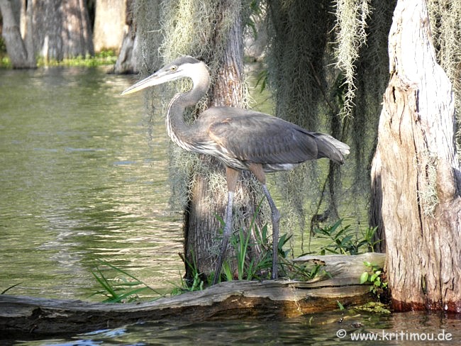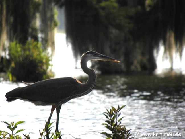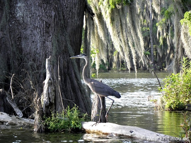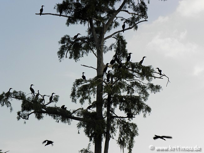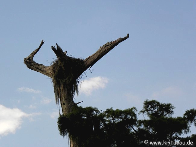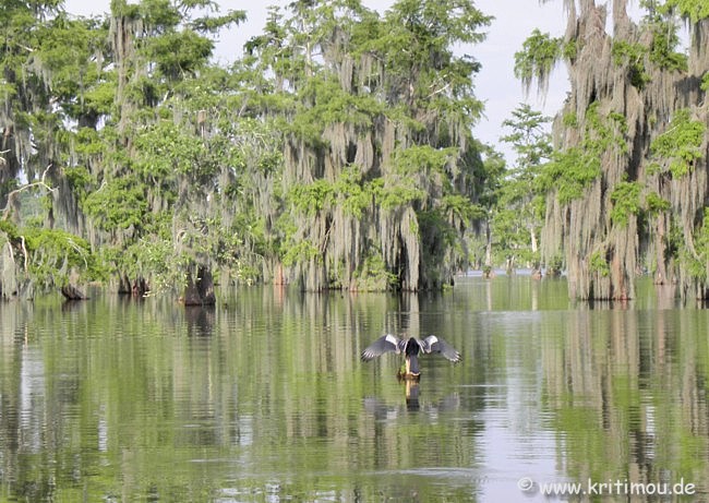 Wer sich das Gefieder so nass gemacht hat, muss auch zusehen, dass es wieder trocknet. ![]() Weiter geht es zur benachbarten Uferlinie. Bei der Einfahrt in den Sumpfzypressenwald wähnt man sich in einer anderen Welt. Augenblicklich verstummen die Gespräche an Bord, so beeindruckend ist dieses Gefühl.