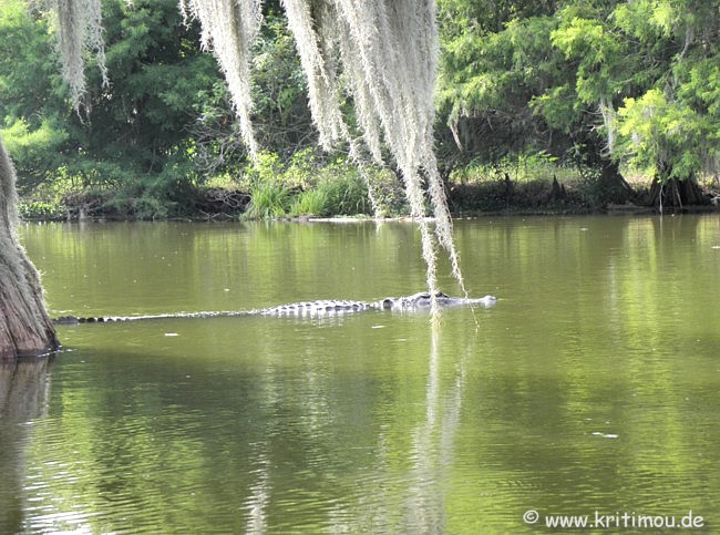 ![]() Ist das hier ein Gator oder ein Stück Holz? ![]() Dieser Schöne ist zweifellos ein Alligator. ![]() und noch eine Knubbelnase Während unseres fast zweistündigen Ausflugs begegnen uns keine weiteren Gruppen anderer Anbieter, sondern lediglich eine Handvoll Privatleute, die vor sich hin paddeln und die friedliche Spätnachmittags-Stimmung ebenso genießen wie wir. Wir halten uns vorwiegend in den sumpfigen Uferregionen auf. Vorsichtshalber hatte ich mich noch ordentlich mit der DEET-Lotion eingeschmiert, es gibt aber keine Moskitos. Trotz der Chemiedröhnung auf der Haut kommt immer wieder eine Libelle angeflogen, die sich daraus nichts macht, und auf meinem Zeigefinger sitzen bleibt. Es ist ein so zartes, feingliedriges Geschöpf mit anmutig, langen Flügeln, das ich direkt vor meinen Augen bewundern darf. Ich bin beglückt. Auf einem Baumstumpf sehen wir bei der Vorbeifahrt zwei Tiere in friedlicher Koexistenz: eine ausgewachsene Sumpfschildkröte und einen Alligator, die sich zusammen den Liegeplatz teilen und ihre Panzer genüsslich in die Sonne halten. ![]() Alligatoren lassen sich von Krokodilen sehr leicht unterscheiden: Ihre Farbe ist dunkel, ihr Maul ist platt und eher rechteckig, die Zähne liegen bei geschossenem Maul weitestgehend im Kiefer. Aber beide haben Knubbelnasen. ![]() Sieht das vielleicht cool und entspannt aus? Was mich unglaublich fasziniert, sind die Sumpflanzen in allen Grün-Schattierungen. Am eindrucksvollsten finde ich die Sumpfzypressen mit ihrem Schmuck aus Spanish Moss. „Das ist auch eine Pflanze“, erläutert Shawn für alle, die das nicht wussten. Ganz langsam gleiten wir unter dem dichten Gewebe des Spanish-Moss-Gehänges hindurch, damit wir es berühren können. Mein Nachbar hinter mir tippt mir auf die Schulter und zeigt mir einen Zweig mit einigen zarten Blütchen, den er gerade gepflückt hat.